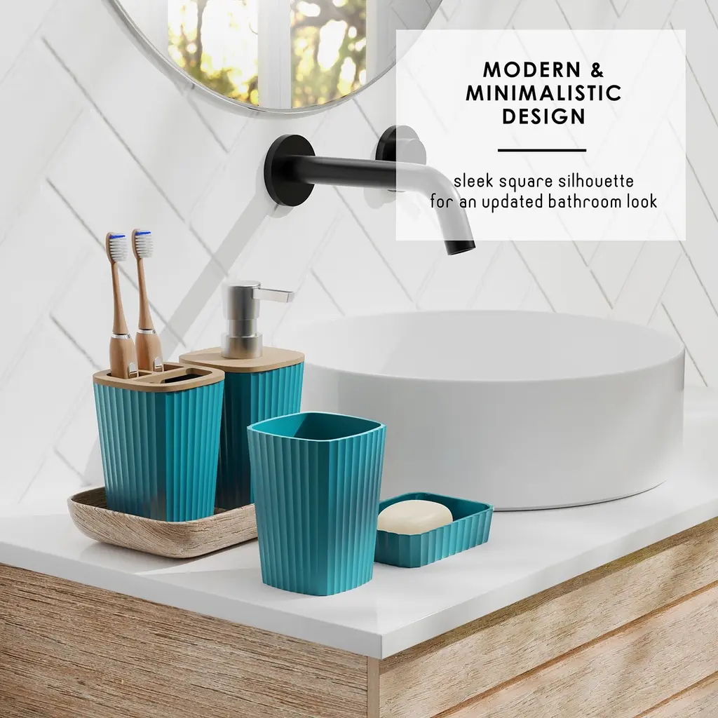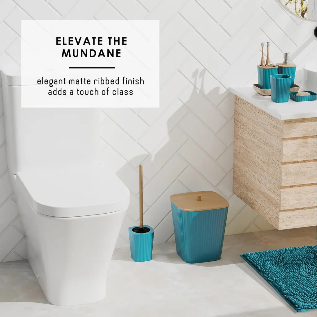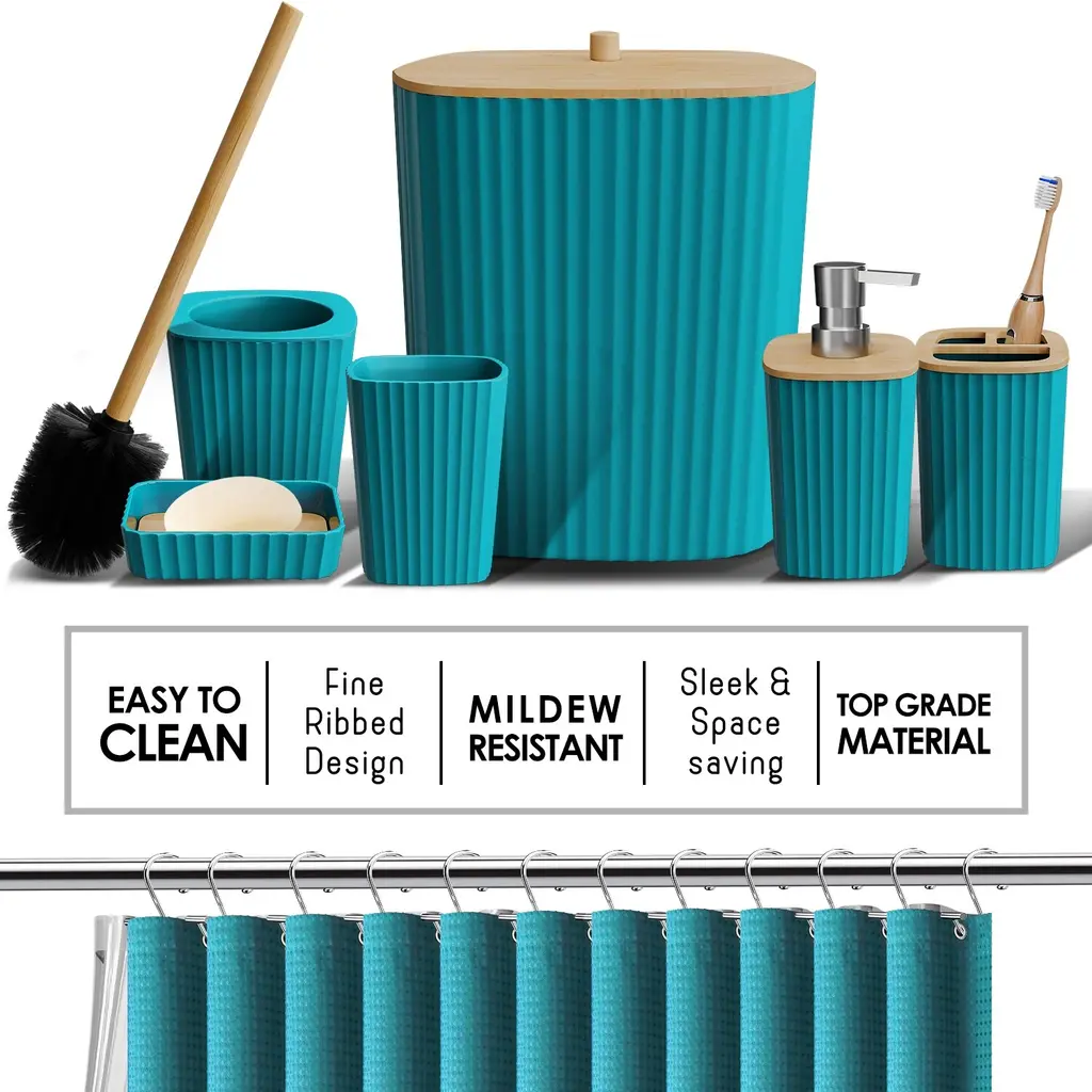 Clara Clark Bamboo Bathroom Accessories Set With Shower Curtain Set, Toilet Brush, Trash Can & Soap Dispenser - Complete Set + Bath Rugs - Teal
