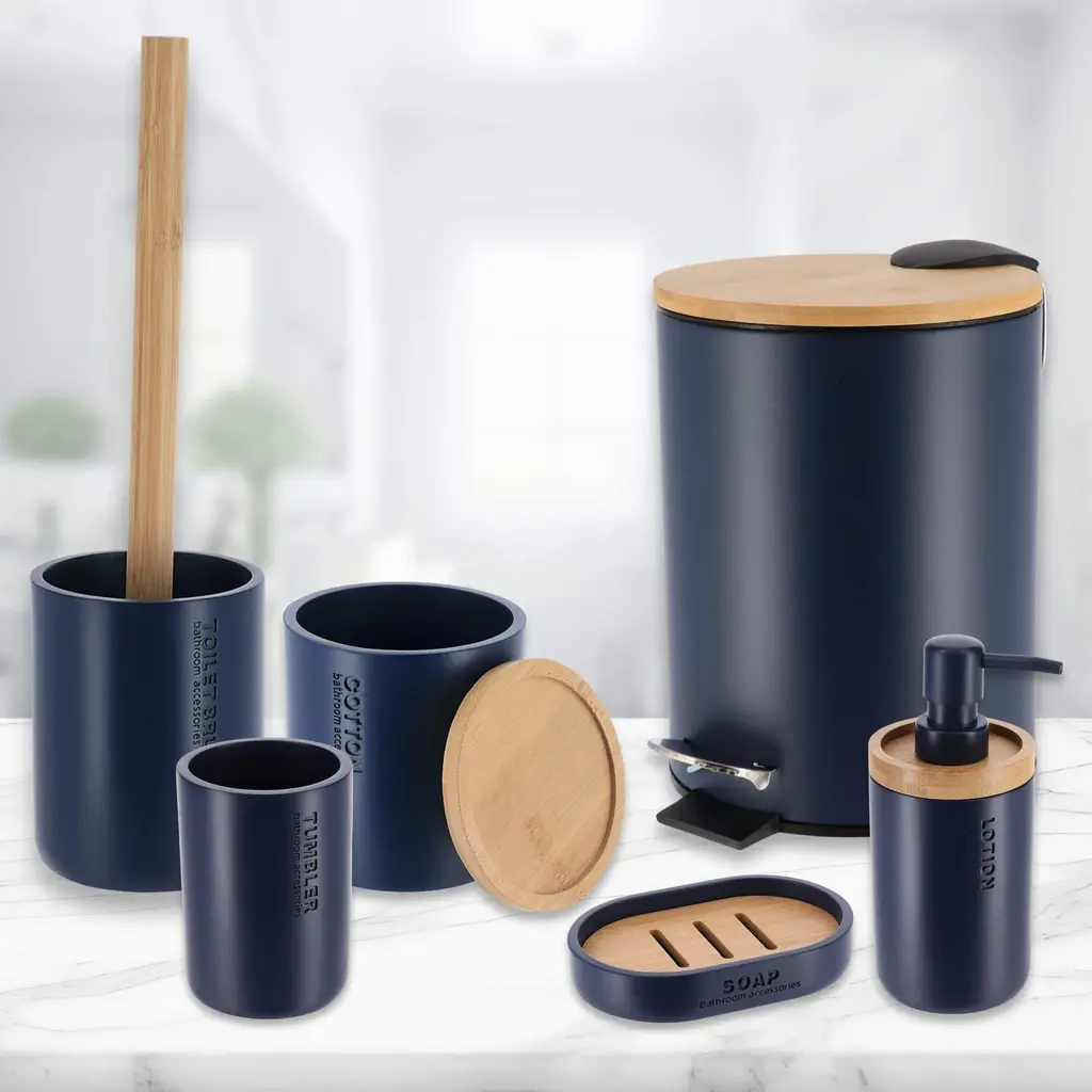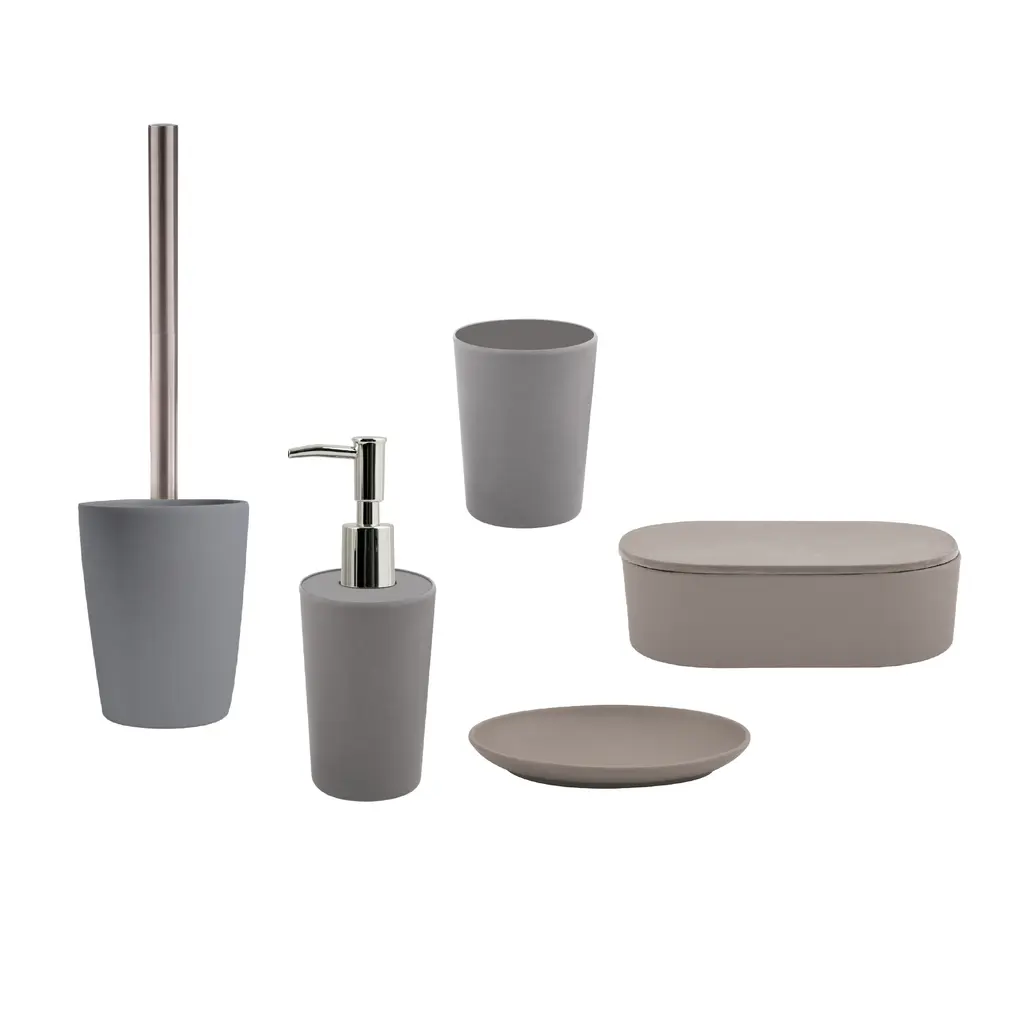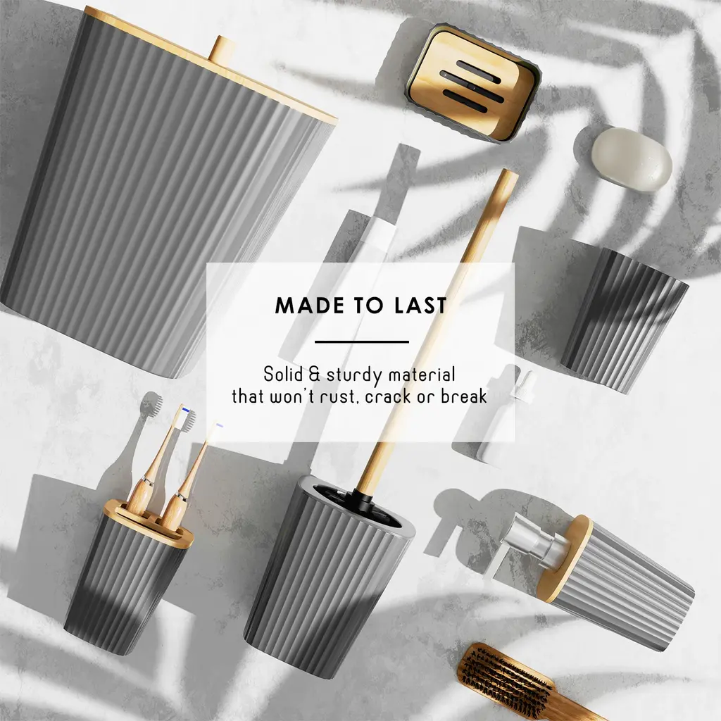 Clara Clark Bamboo Bathroom Accessories Set With Shower Curtain Set, Toilet Brush, Trash Can & Soap Dispenser - Complete Set - Grey