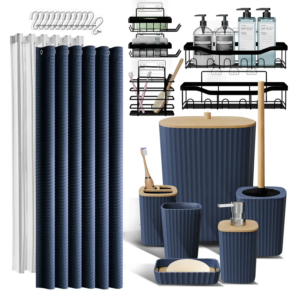 Transform your bathroom into a sophisticated oasis with our complete bathroom accessories set, featuring natural bamboo accents. The set includes a waffle-textured shower curtain set with a clear shower curtain liner and 12 shower curtain hooks, a variety of essential bathroom items, and the additional option of 2 non-slip, plush, chenille bath rugs. Designed for both style and organization, our elegant bathroom accessories turn your bathroom into a spa-like retreat, making each moment a luxurious experience.Features: Inclusions & Dimensions:
