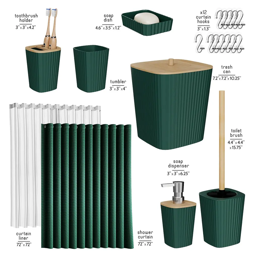 Clara Clark Bamboo Bathroom Accessories Set With Shower Curtain Set, Toilet Brush, Trash Can & Soap Dispenser - Complete Set - Hunter Green