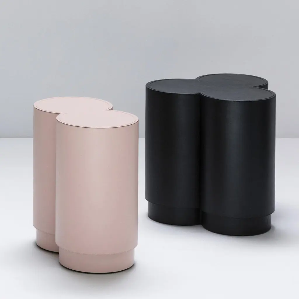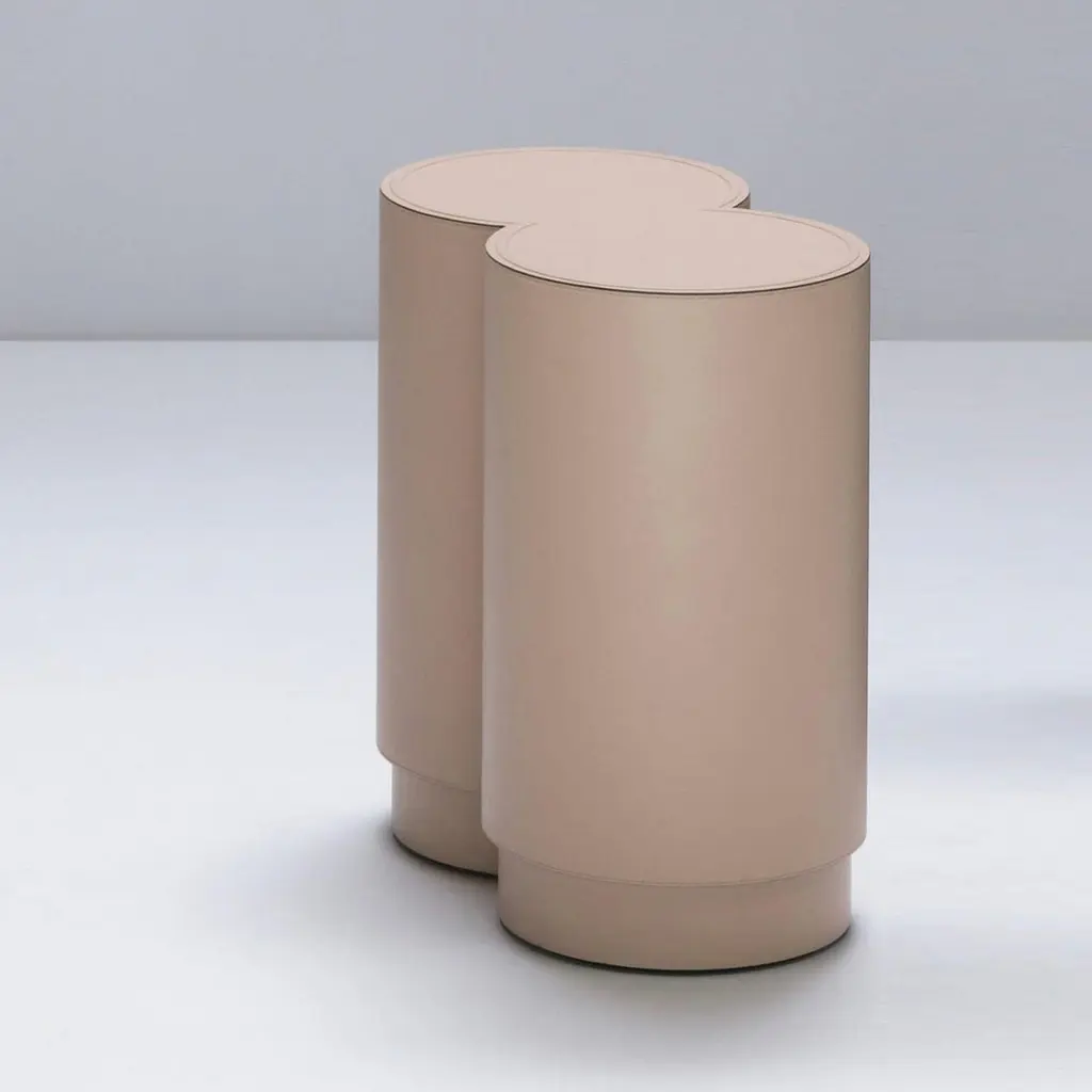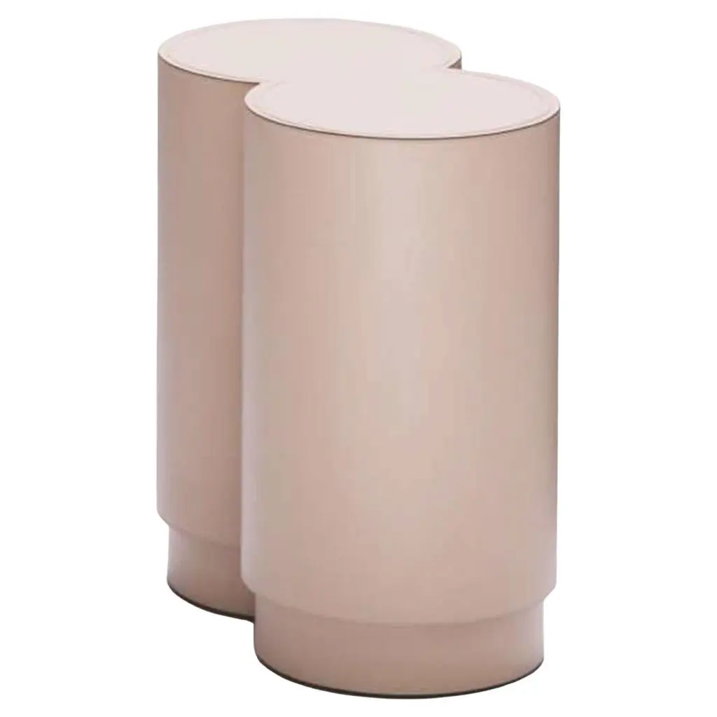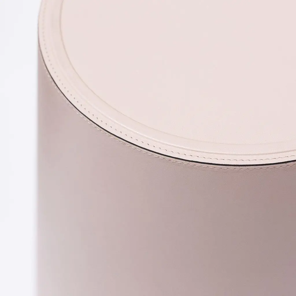 Contemporary leather stool - Binity by Stephane Parmentier for Giobagnara.The object presented in the image has following finish: F91 nude nappa leatherThe key to these pieces's elegance is an absolute precision of proportions, influenced by the timeless allure of Art Deco.The perfect companion to the Trinity Stool, this modern design will bring quiet elegance to a neutral-palette interior or balance a vibrant eclectic decor. Entirely upholstered in soft nappa leather, this stool features a sophisticated powder pink color that enhances the harmonious proportions of the charming silhouette.Design: Stéphane ParmentierMaterial: Golf, suede or nappa leather, fully leather covered.Dimensions (in): W 17.91 x D 10.04 x H 17.91Dimensions (cm): W 45.5 x D 25.5 x H 45.5Made by hand, in Italy.This item is made to order. Please choose the finish that you want for your piece.