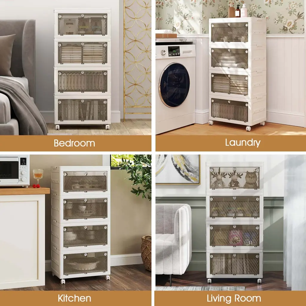 Discover the convenience of innovative storage with our stackable storage bins, designed to accommodate your dynamic storage needs while optimizing space. These storage bins boast a generous capacity of 33/44 gallons, making them suitable for housing a diverse array of items. From seasonal garments to assorted snacks, these containers handle a large variety of storage demands, helping maintain a tidy environment. Each bin includes a top lid and dual doors, providing triple access to contents, which makes item retrieval straightforward. The see-through doors, equipped with smooth sliding latches, offer a clear view of the stored items. For added practicality, each bin is equipped with four rolling casters for easy transportation. Featuring snap buckles on both sides, the bins can be easily connected or detached. Simple yet functional, the storage bins with drawers offer a practical addition to any home, enhancing the way you organize and access your wardrobe.FeaturePre-connected parts and half-fold side panels for quick-fold assembly 33/44-gal generous capacity to accommodate a wide range of items 3 ways to open the drawer with top open, front open with lock, back open with lock 4 rolling casters make it simple to move them around 2 lockable casters ensures stability Snap buckles on both sides to quickly connect or disconnect the units Stackable design of the storage organizer is space-saving Suitable for the bedroom, cloakroom, clothing store, laundry room,kitchen, etc.SpecificationColor: White + Brown Material: PP, HIPS Overall Dimensions: 21" x 13" x 35.5"/21" x 13" x 46" (L x W x H) Folding Dimensions: 21" x 13" x 10.5"/21" x 13" x 13" (L x W x H) Storage Capacity: 33/44 Gal Weight Capacity: 66/88 lbs Net Weight: 11/14.5 lbs Package Includes: 1 x Stackable Storage Bins 1 x User Manual