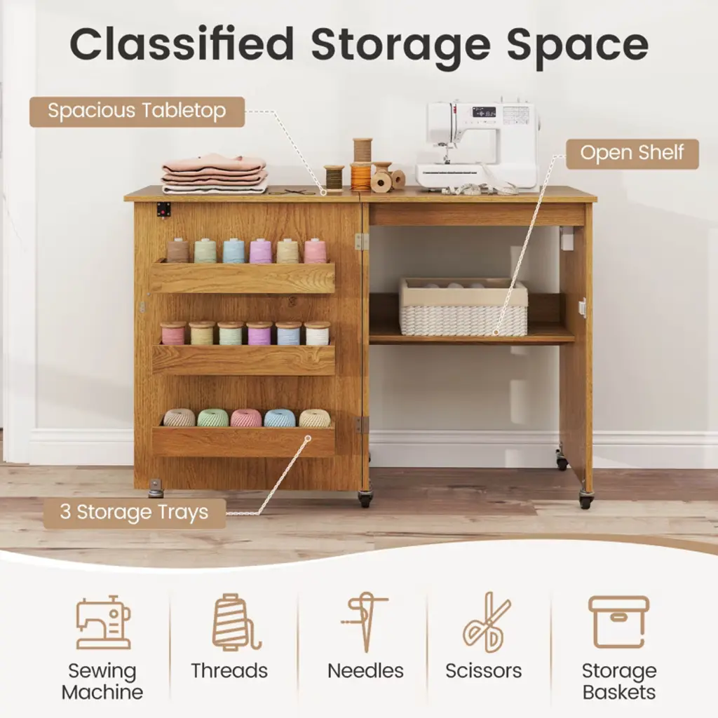 Take your crafting to the next level with this versatile folding sewing desk! The built-in charging station on side provides flexible power source while maintaining a tidy tabletop. In addition to the ample workspace, you will discover a handy storage shelf and 3 bins below, perfect for organizing threads, needles, and scissors. For added convenience, 5 smooth rolling wheels allow you to relocate your sewing station effortlessly and securely lock it in place. When not in use, the craft station table conveniently folds away to free up space. Whether used for your home, studio, or any small space, this versatile sewing table combines convenience and efficiency.FeaturesIntegrated charging station to charge multiple electronics with ease Spacious tabletop provides a generous work area for you 3 storage trays and open shelf for sewing tools and storage baskets Foldable design saves much space and caters to different needs Use as a sewing machine table, computer desk or side table 5 smooth rolling casters, 3 with brakes for added stability Spring latch to keep the extended tabletop in place User-friendly accessories include anti-collision pads to avoid slams Assembly neededColor: White/Natural/Brown Material: Engineered Wood, Metal Expanded Dimensions: 45.5" x 16" x 31" (L x W x H) Folded Dimensions: 23" x 16" x 31" (L x W x H) Dimensions of Tray: 14.5" x 4.5" x 2" (W x D x H) Dimensions of Open Shelf: 21" x 8.5" x 16" (L x W x H) Power Cord Length: 4.8 ft 2 AC Outlets: 125V/12A 1 USB Port & Type-C Port: 5V/2.4A Weight Capacity of Fixed Tabletop: 45 lbs Weight Capacity of Folding Part: 45 lbs Weight Capacity of Shelf: 22 lbs Net Weight: 43 lbs Package Includes: 1 x Folding Sewing Table 1 x Instruction