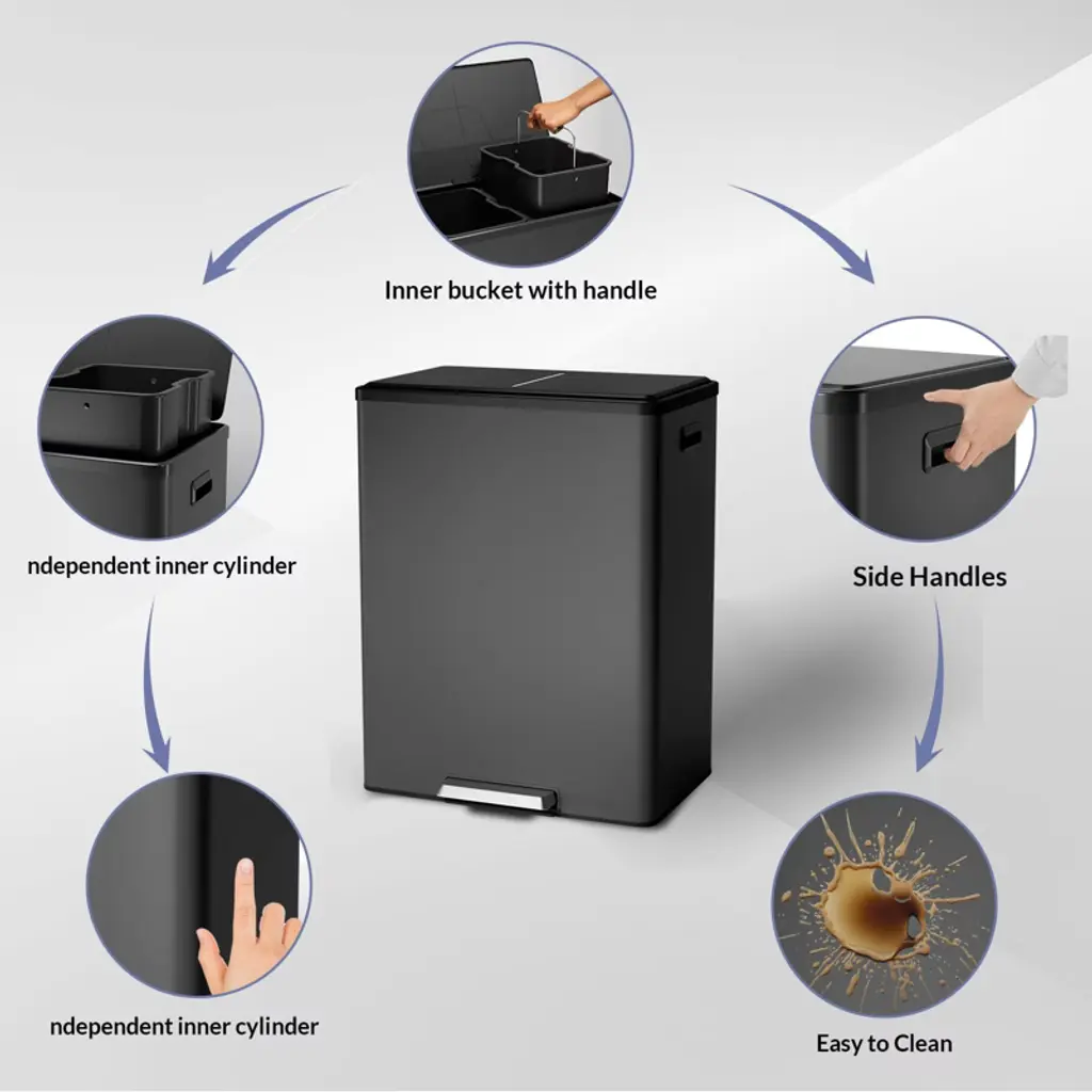 This Kitchen Dual Trash Can offers a 16-gallon capacity (60 liters) and features a dual compartment design for waste separation and recycling. Made of durable stainless steel, this bin is both modern and easy to clean, perfect for home, office, or business use. The soft close lid ensures a quiet, secure closure every time, while the removable inner bins make disposal and cleaning hassle-free. A sleek and efficient solution for organizing trash and recycling in any space.