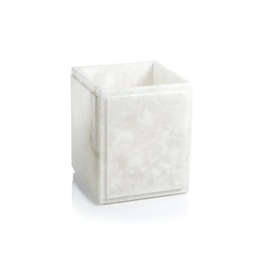 A rectangular wastebasket is crafted of white alabaster with subtle natural veining and a smooth finish. Pair with the full Cremona bath collection for a coordinated look. Features: Satin Polish Natural white alabaster Sturdy and durable quality With clear anti-slip bumpers at the bottom Variations in veining and color Can also be used as a storage basket