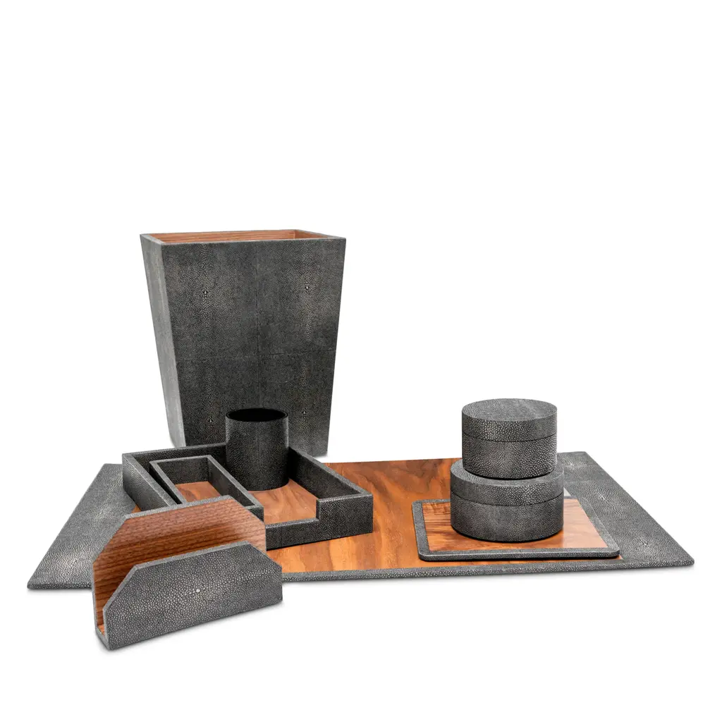 Introduce luxury and texture into your study or office space with the Pigeon & Poodle Crosby Collection of desk accessories, each with a durable faux shagreen finish lined with wood veneer.