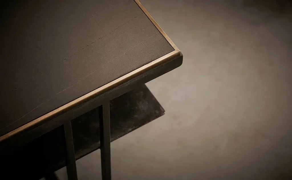 A console table in blackened steel and honed Cumbrian slate, with a polished brass trim. Hand crafted to order in the North. Bespoke finishes and sizes are available.Measures: 150cm (length) x 30cm (width) x 80cm (height).Custom sizes available.Made to order in 12 weeks.Price excludes VAT.