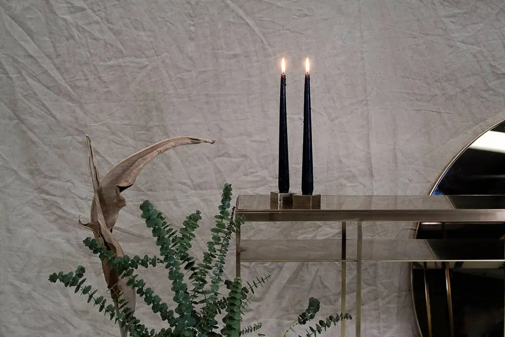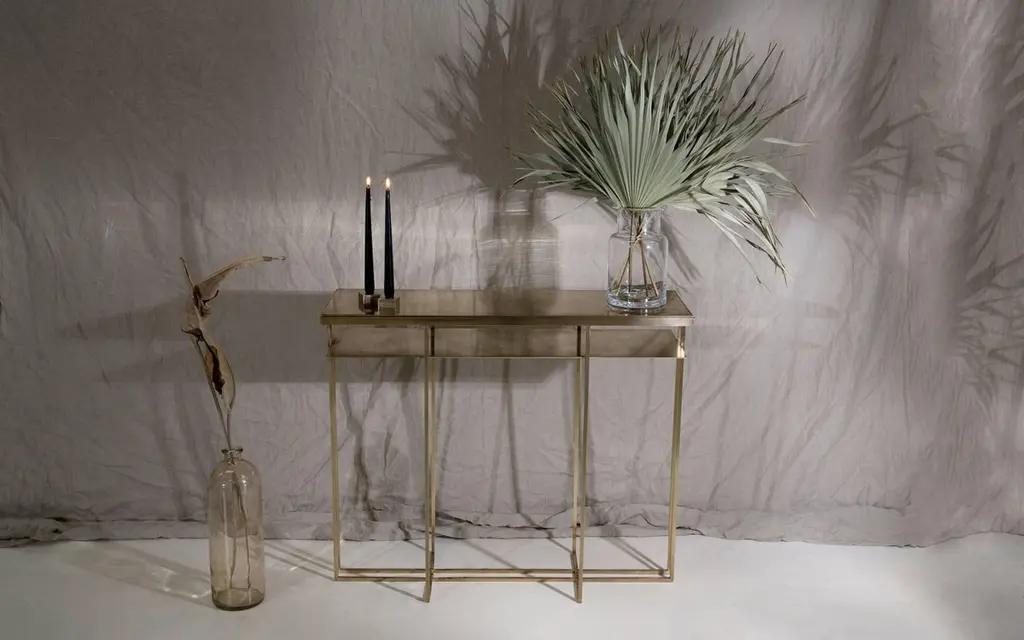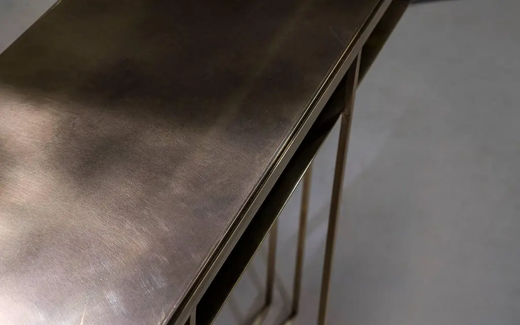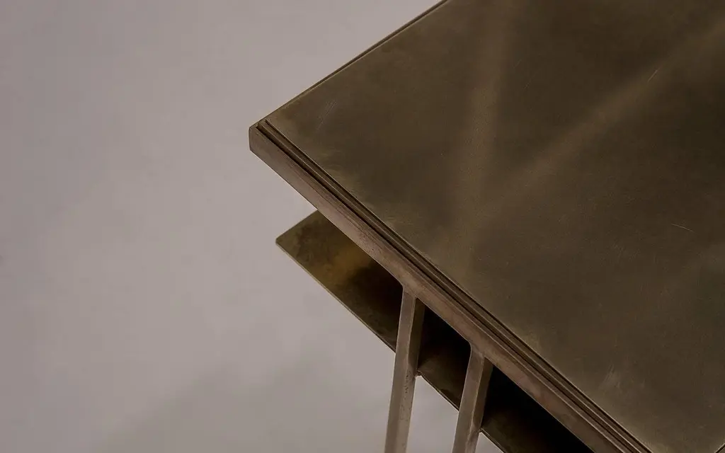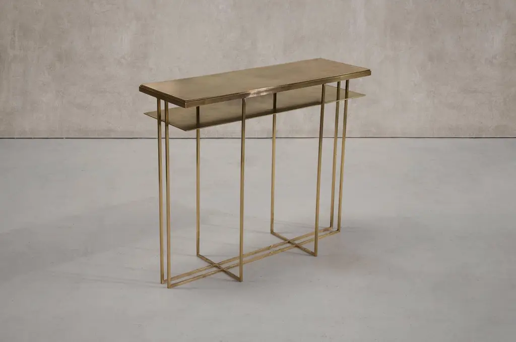 A console table in patinated brass. Hand crafted to order in the North. Bespoke finishes and sizes are available.Measures: 120cm (length) x 25cm (width) x 80cm (height). Custom sizes available.Made to order in 12 weeks.Price excludes VAT.