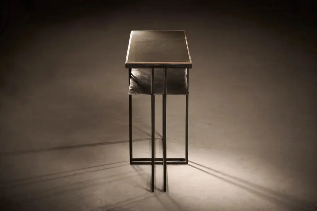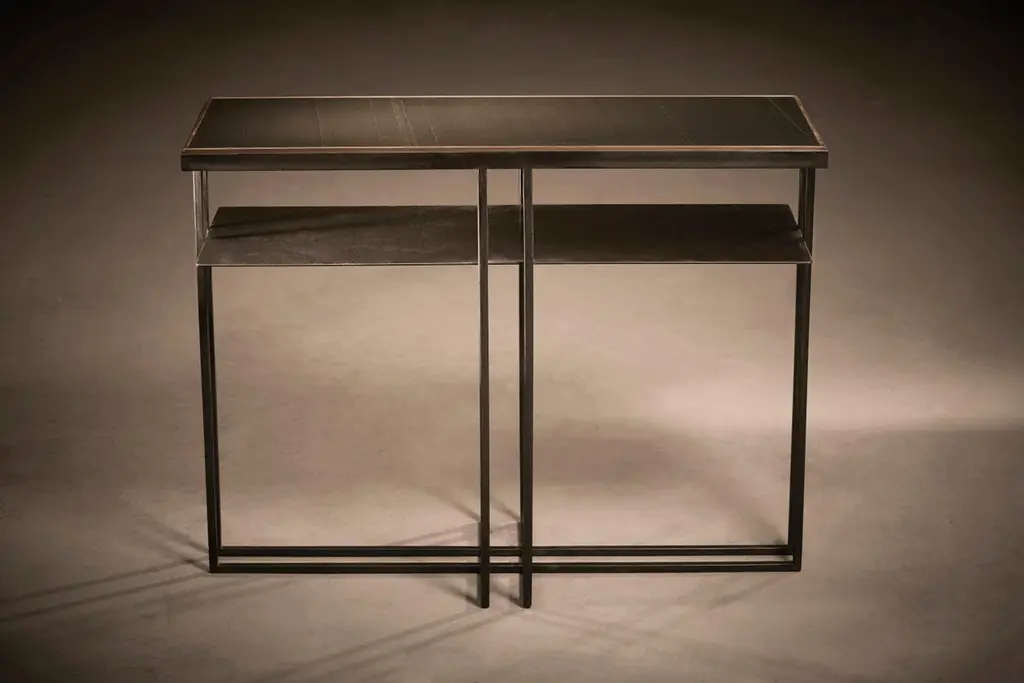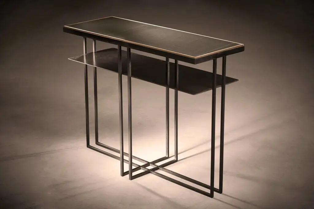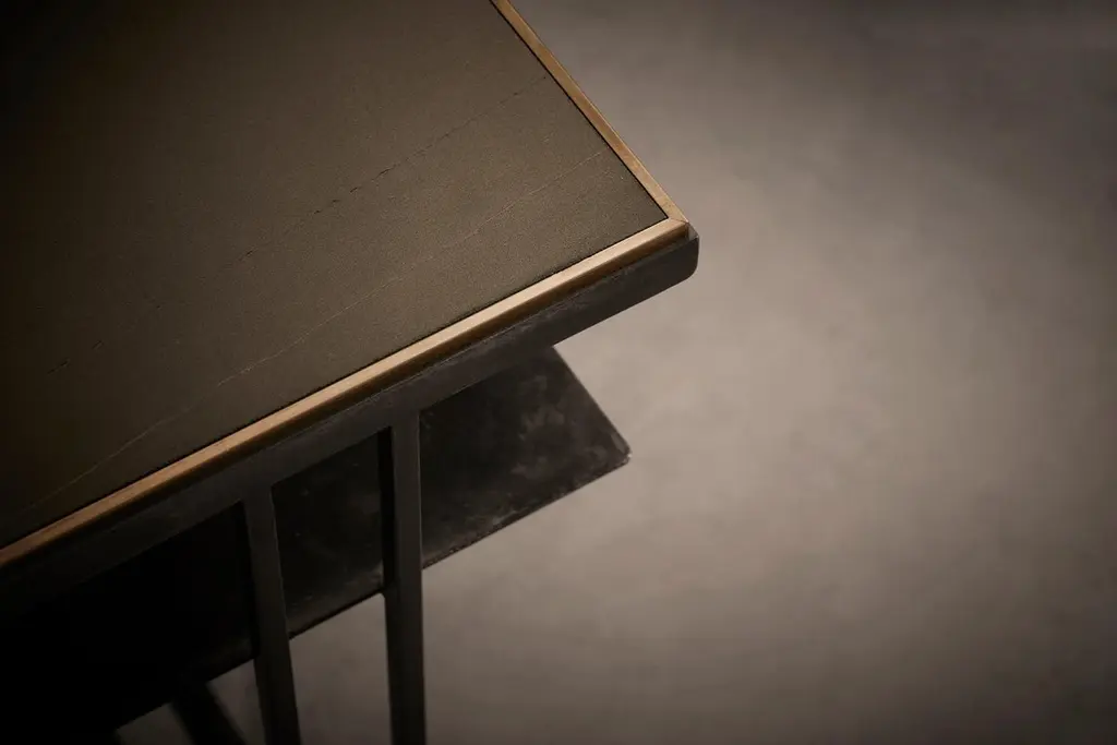 A side table in blackened steel and honed Cumbrian slate, with a polished brass trim. Hand crafted in the North to order. Custom sizes and finishes are available.Measures: 71cm (length) x 25cm (width) x 55cm (height). Custom sizes available.Made to order in 12 weeks.Price excludes VAT.