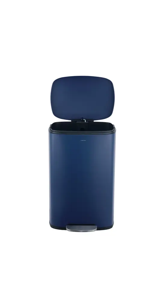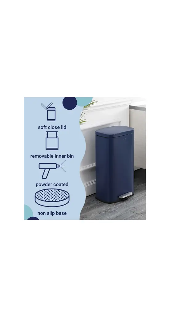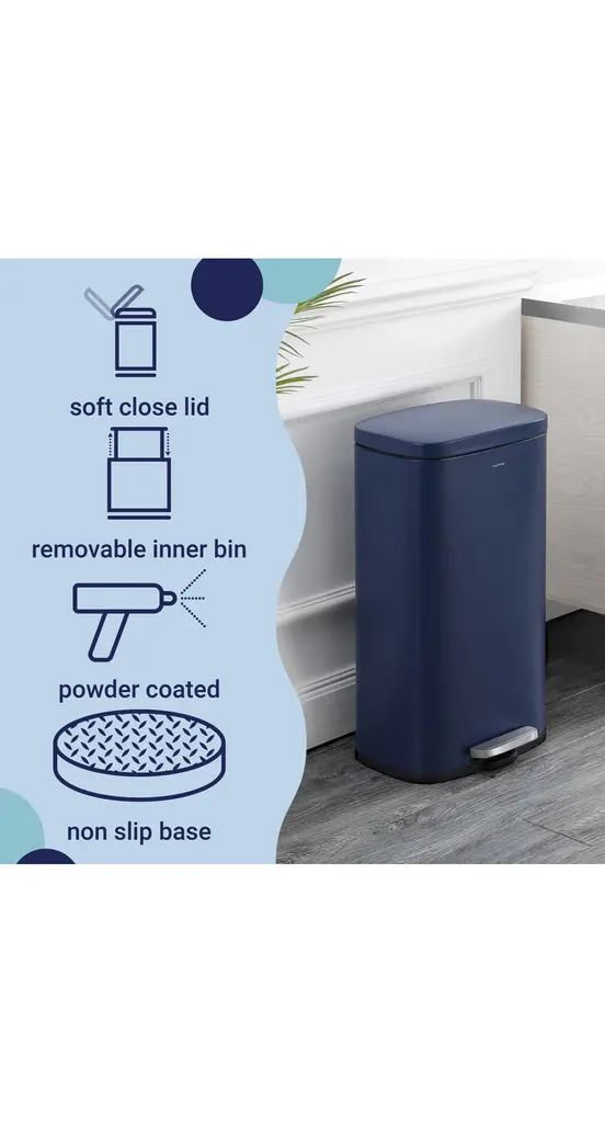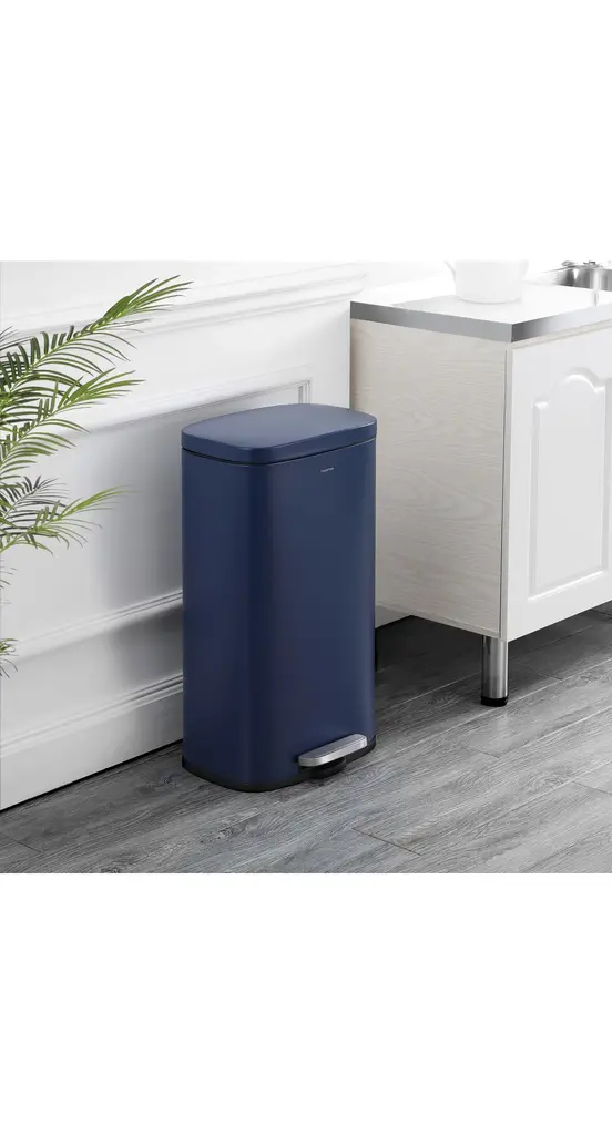 Our classic trash can combines quality construction with modern styling for your kitchen or office. A satin finish suits any decor, and the tall, narrow shape fits easily into a small space. Dispose of trash hands-free with the convenient step pedal.Navy and black with a satin finishRustproof stainless steel constructionSoft close feature eliminates slamming -- making it less noisy, and safer for familiesHands-free step pedal with a built-in damper to gently lower the lidSteel pedal ensures durability, so the open feature lasts for years to comeColor: Denim BlueContent: Iron/Polypropylene/ABSStorage Capacity:Number of Shelves:Number of Hooks:Weight Capacity: 8 Gallons lbs.Item Weight: 8.6 lbs.Minor Assembly Required (no tools needed)Dimension: 13.78 in. W x 11.81 in. D x 25 in. HHappimess storage solutions by Jonathan Y are designed to help you declutter your home in style. When you embark the home organization journey with us, rest assured we've thought of everything you need to organize your home beautifully, efficiently and affordably - and to keep it that way.Our passion is to create products good looking enough to motivate you to organize every room. But at Jonathan Y, we know aesthetics are just one element to achieving a stress-free, clutter-free home. That's every product that carries the happimess label must perform impeccably, be easy to install and delivered to your door hassle-free.happimess. Storage solutions to make you smile.