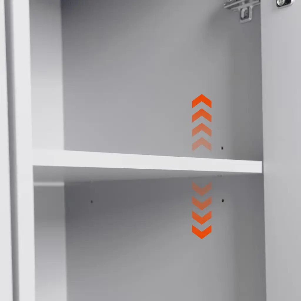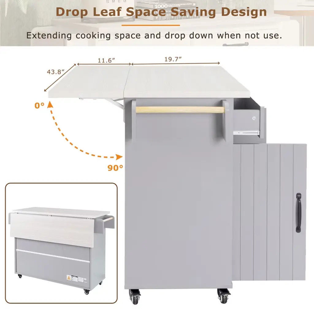 In addition to being used for kitchen waste, this bin can also store pet food, the hidden design won't allow pets to rummage around, and when used indoors, it can also store some clothes that need to be washed. No odors will leak out when the cabinet door is closed, making the room cleaner. This mobile kitchen island on wheels is equipped with 5 universal wheels, 4 of which are lockable. Additionally, we offer six stationary cabinet feet as an alternative option if you prefer a stationary cabinet setup. The kitchen cart with a drop leaf countertop, the drop leaf can be opened or folded freely according to the needs of use and environment. When you don't need it, you can fold it and place it against the wall, which saves storage space and makes space management easier. The shelf inside the storage cabinet is designed to be 3-level adjustable for catering to your needs of storing items varied in size. It can house a 9-gallon trash can (not included), measuring 12" x 11.65" x 15.75" can meet most of the needs, and can tilt out up to 35 degrees. Our white kitchen island's collapsible drop leaf design with sturdy support makes it perfect for compact spaces,seamlessly transforming into a bar cart or mobile coffee center. The wood grain table top is made from high-quality and environmental P2-grade particleboard with a beautiful and intricate grain pattern. The rich tones and textures of the wood create a warm and inviting atmosphere in your kitchen.