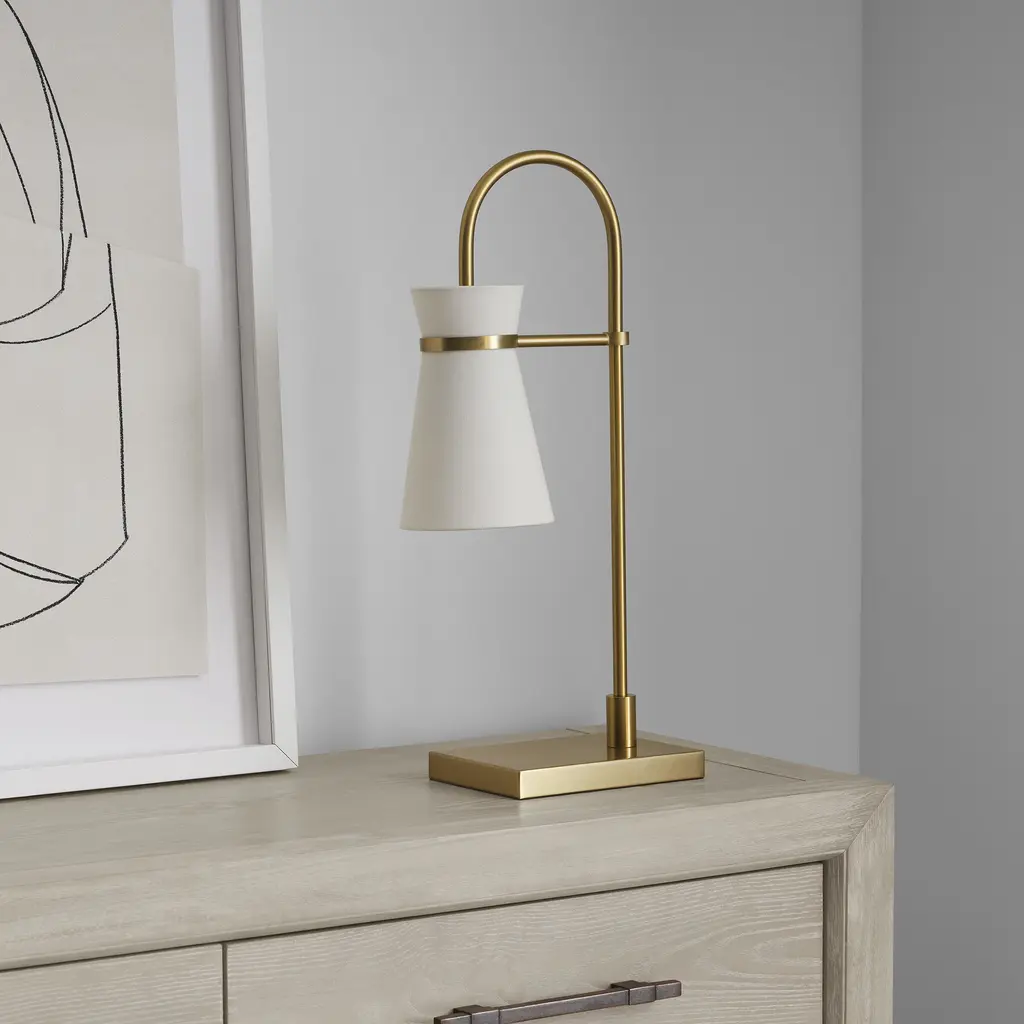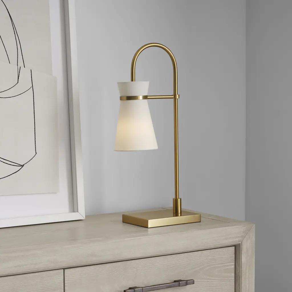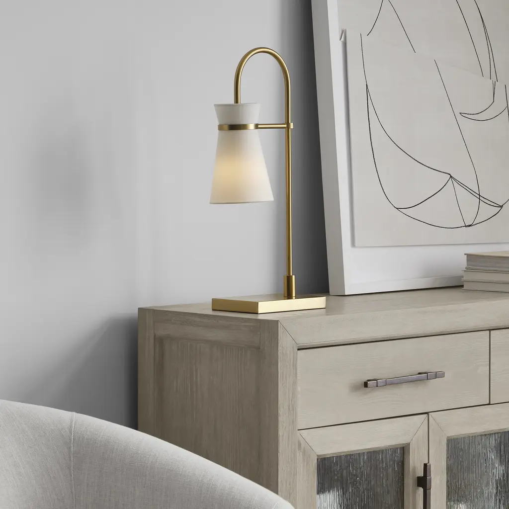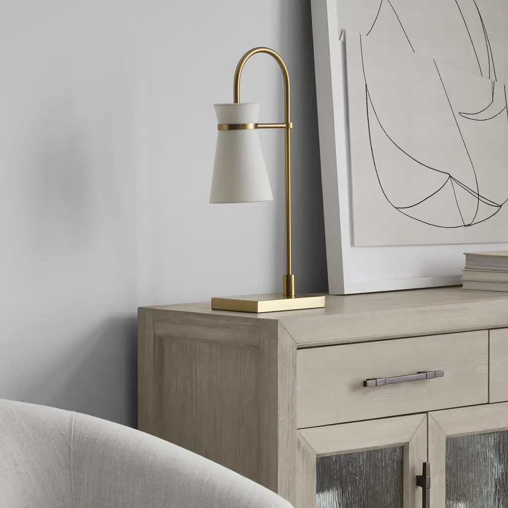 Designed by Drew & Jonathan Scott, Binx is a small-scale task table lamp with a slight equestrian look. Trimmed in Midnight Black or Satin Brass, this sleek task lamp flaunts a slender neck and flared shade full of retro flair.