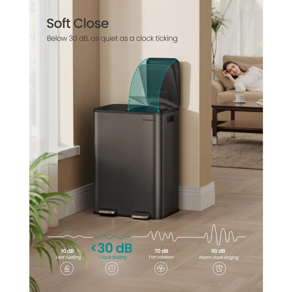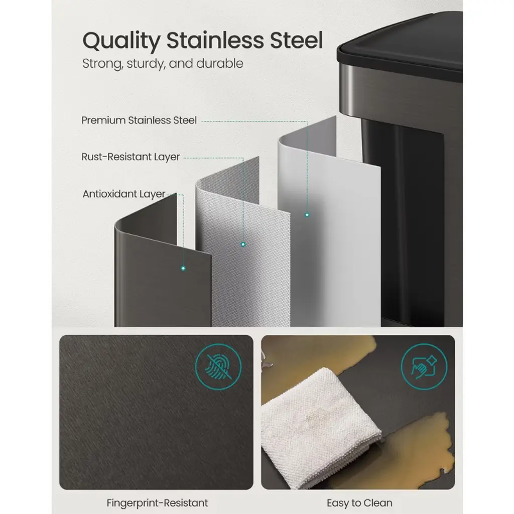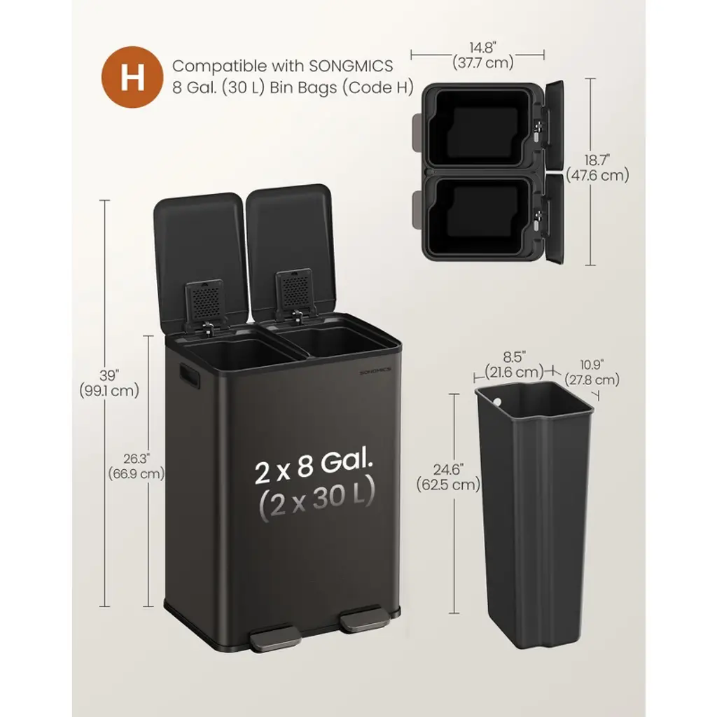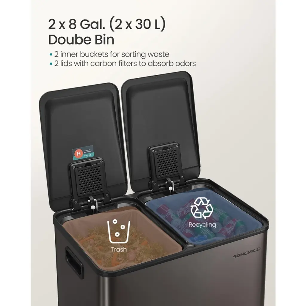 This premium dual-compartment trash can features two 8-gallon removable buckets for efficient waste sorting, crafted from durable stainless steel in a sleek slate gray finish. The convenient foot pedal allows hands-free operation, while the soft-close lid ensures quiet, slam-proof closure. Includes 15 compatible trash bags (fits standard 8-gallon H-code liners) and features secure bag holders to prevent slippage. Perfect for kitchens needing organized waste management, its space-saving design maintains a clean look while providing ample capacity. The rust-resistant steel construction guarantees long-lasting performance with easy-to-clean surfaces. Material: Steel, PP Plastic Product Size (with Pedal): 18.7"L x 14.8"W x 26.3"H (47.6 x 37.7 x 66.9 cm) Height with Lid Open: 39" (99.1 cm) Size of Each Inner Bucket: 10.9"L x 8.5"W x 24.6"H (27.8 x 21.6 x 62.5 cm) Pedal Size: 4.5"L x 1.9"W (11.5 x 4.8 cm) Volume: 2 x 8 Gallons (2 x 30 L) Product Weight: 16.2 lb (7.4 kg)
