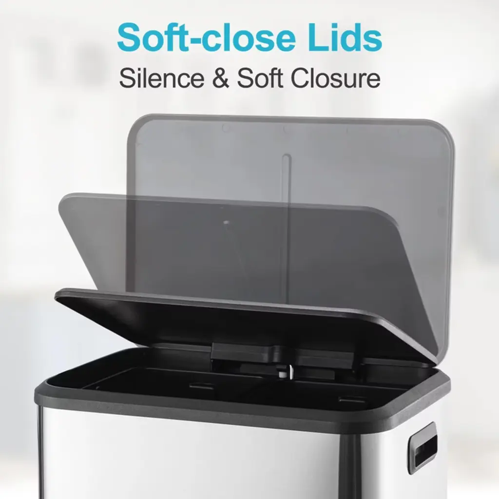 Dual Compartment Trash Can with Lid, 2x4 Gallons (30L) Stainless Steel Waste Bin with 2 Removable Inner Bucket and Soft Close Lid for Courtyard, Bedroom