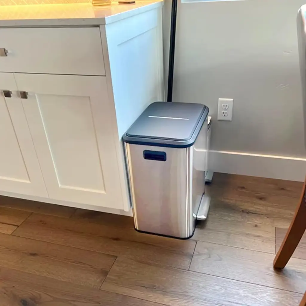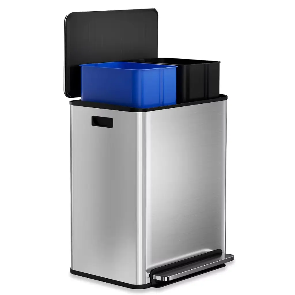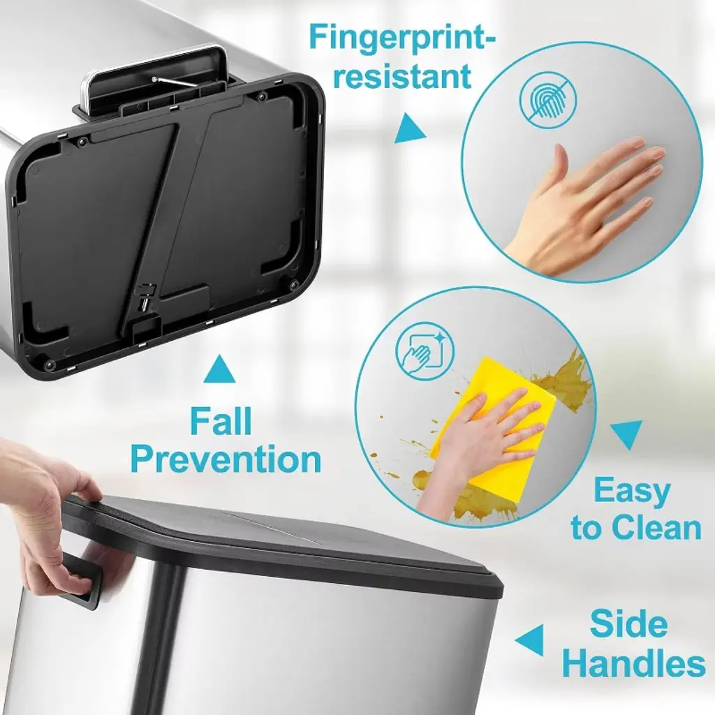Hands-free Operation Kitchen Trash Can: The strong steel pedal allows for hands-free operation, which is especially useful when your hands are full in the kitchen. This makes it easier to dispose of waste without having to touch the trash can. Silence & Soft Closure Garbage Can: The soft-close lid ensures that the environment remains peaceful, and the internal hinge design prevents the lid from bumping the wall. This feature eliminates loud slamming sounds, which can be very annoying to the ears. Cleaner Kitchen Environment: The stainless steel material resists fingerprints and the spread of dirty things without dulling the natural sheen and luster of the steel. The bottom seal helps to maintain a cleaner kitchen environment by preventing spills and leaks from the trash can. Dual Compartments Recycle Bin: The double inner barrel design allows for dry and wet classification, as well as recyclable and non-recyclable classification. The inner bucket has a storage hole and is designed to fit a minimum 40cm opening and a height of 65cm for garbage bags, making it easier to dispose of waste and maintain the cleanliness of the kitchen. Compact Design: The dual compartment recycling kitchen step trash can has a compact and space-saving design that makes it ideal for use in small kitchens or homes with limited space. Despite its compact size, the trash can features two separate compartments for easy sorting and disposal of trash and recyclables, making it a convenient and practical choice for households of all sizes.
