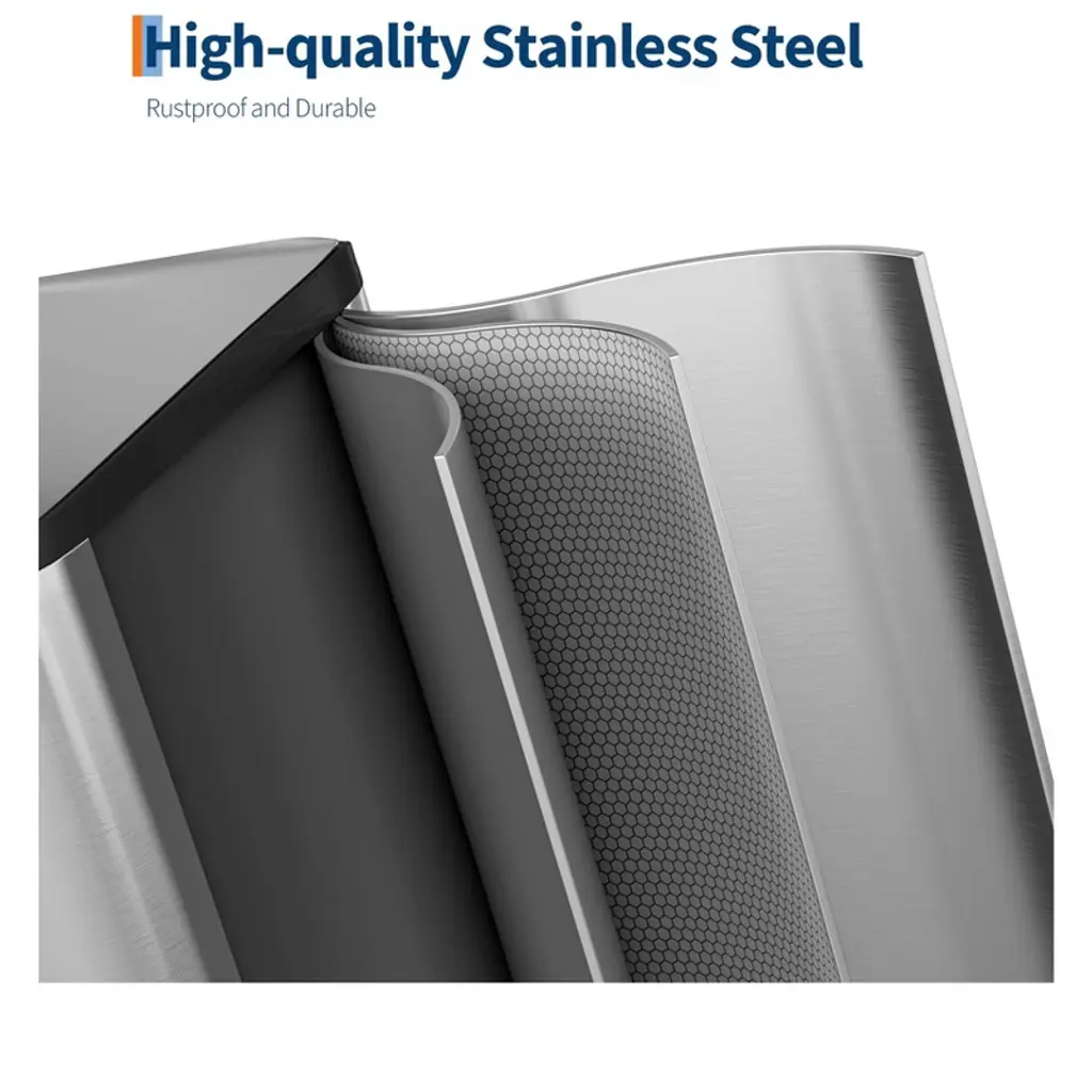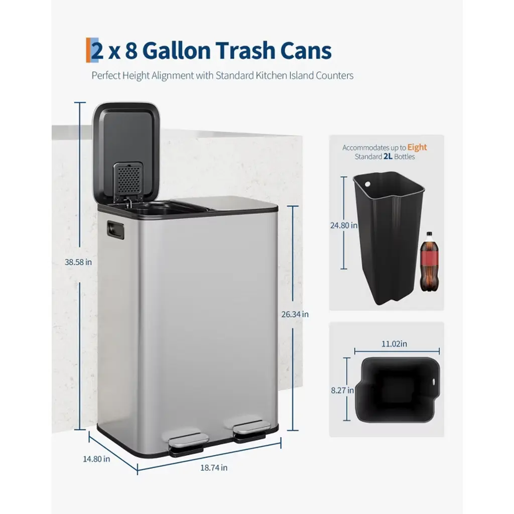Say goodbye to clutter and hello to efficient organization! This dual-compartment stainless steel trash can seamlessly blends modern design with practical functionality, revolutionizing your cleaning routine. It's the perfect choice to enhance both the style and sustainability of any space, from busy kitchens and elegant dining rooms to private bathrooms.Specification:Material: Stainless SteelDimension: 25.32x15.83x38.58 inchVolume:30L/40LColor: Black, Gray, WhiteProduct Details:Dual Compartment Design: Features two separate compartments for easy waste and recycling sorting at the source, keeping your space tidy.Premium Stainless Steel Material: Constructed from durable, rust-resistant stainless steel that wipes clean easily for long-lasting use.Soft-Close Lid: Equipped with a quiet-close lid mechanism for smooth and silent operation.Convenient Foot Pedal: The wide foot pedal allows for hands-free, hygienic lid operation, ideal for busy kitchens.Removable Inner Buckets: Includes lift-out buckets in each compartment for effortless waste disposal and quick cleaning.Multi-Scenario Application: Its stylish design makes it perfect for various spaces like the kitchen, dining room, or bathroom.