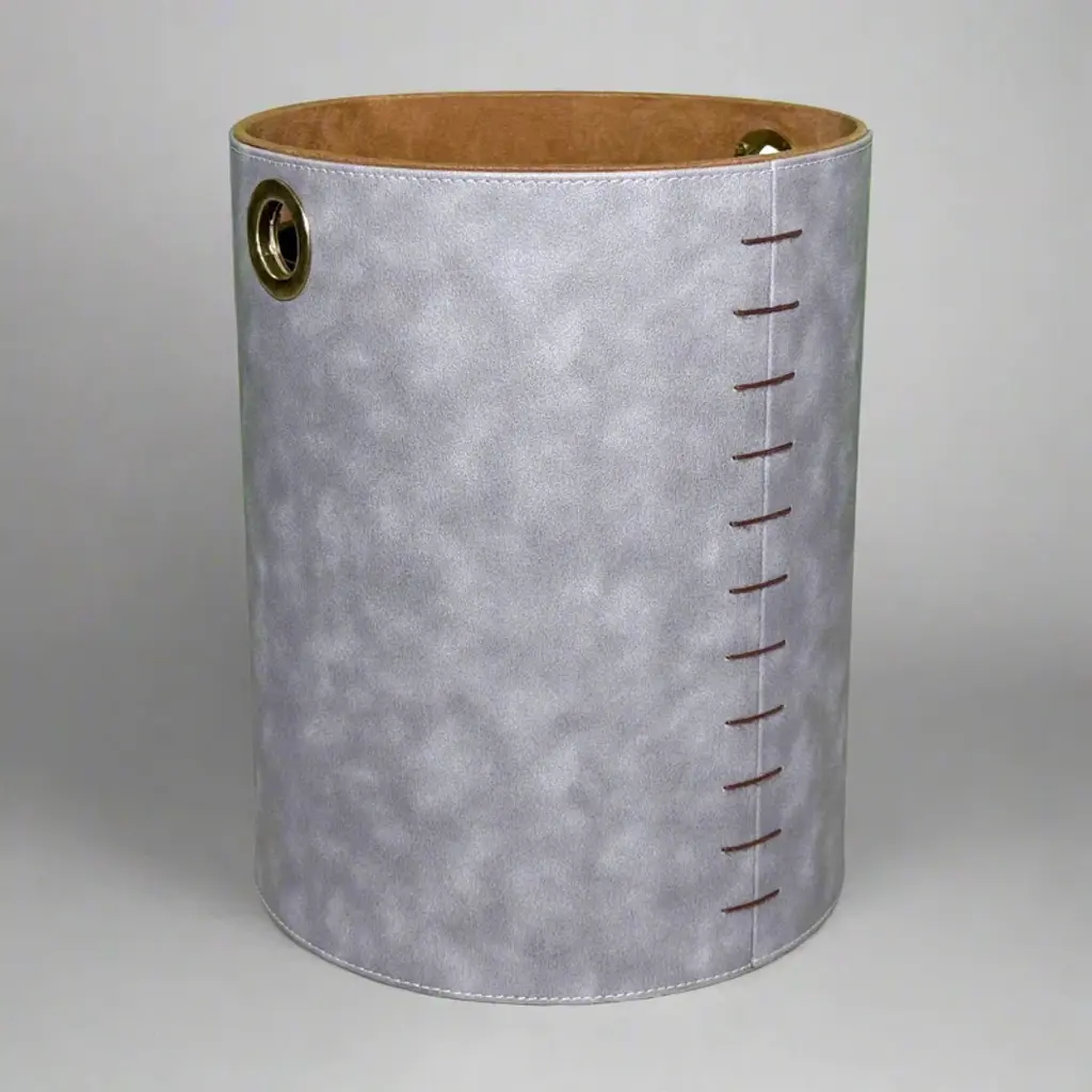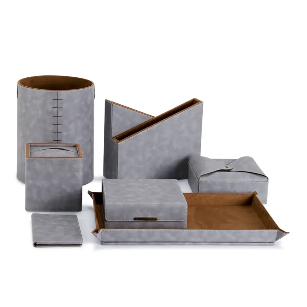 Muted gray grainless leather complemented by brown suede linings and saddle stitching providing loud subtlety, while Champagne gold metal inserts add a touch of opulence. Originally designed for the One & Only Resort, Dubai. Part of a full set.