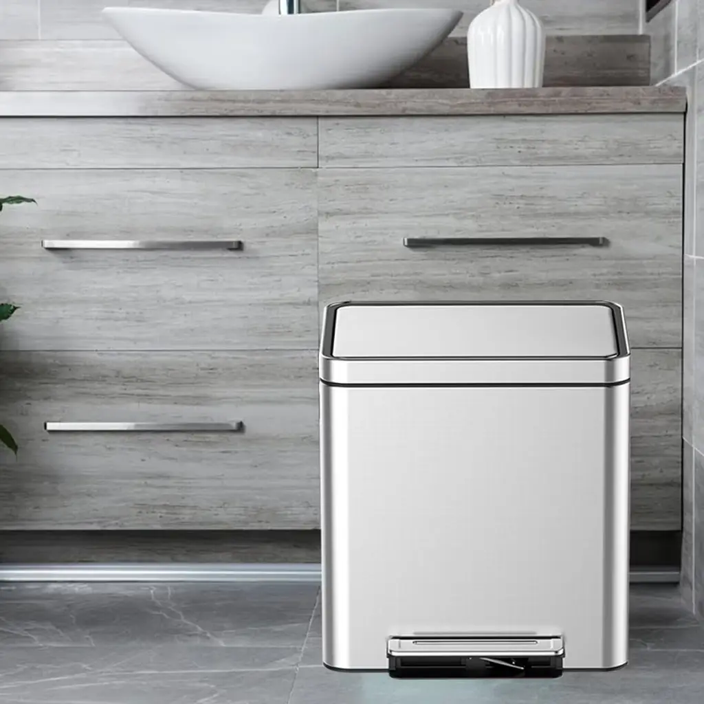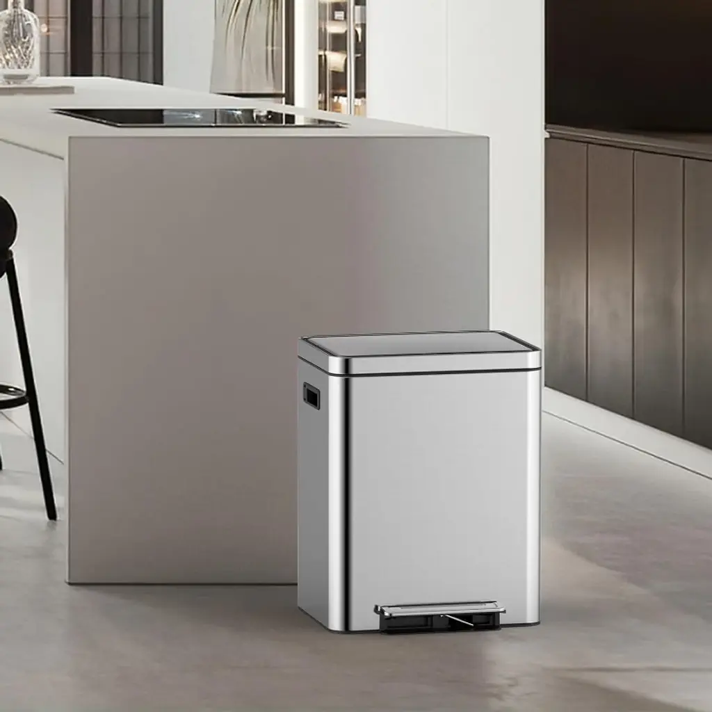 Tired of cluttered bins and messy recycling? Meet the Dual Trash Can with Recycle Bin, a brushed stainless steel powerhouse designed to streamline your kitchen while keeping it stylish. With dual compartments, a soft-close metal lid, and foot pedal convenience, this rectangular bin makes sorting trash and recycling effortless, hygienic, and space-efficient. Key Features: Material: Premium brushed stainless steel exterior + durable plastic inner buckets. Capacity: Dual 2 compartments (Total: 30L/36L/40L) – ample for daily waste. Lid: Quiet soft-close mechanism for noise-free use. Foot Pedal: Heavy-duty pedal for smooth, hands-free access. Assembly: Ready to use right out of the box – no tools needed! Perfect For: Families – Simplify recycling and reduce landfill waste. Small Kitchens – Maximize space with a compact, dual-purpose bin. Modern Homes – Sleek stainless steel elevates your kitchen’s aesthetic. Busy Households – Durable construction handles daily use with ease. Why Choose This Bin? Unlike flimsy plastic bins or single-compartment trash cans, this Dual Stainless Steel Trash Can combines functionality and style. The foot pedal ensures hygiene, the soft-close lid adds luxury, and the dual buckets make waste sorting a breeze. Plus, the stainless steel build resists rust and wipes clean in seconds – no more scrubbing!