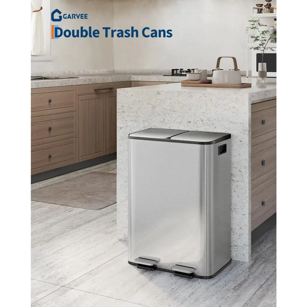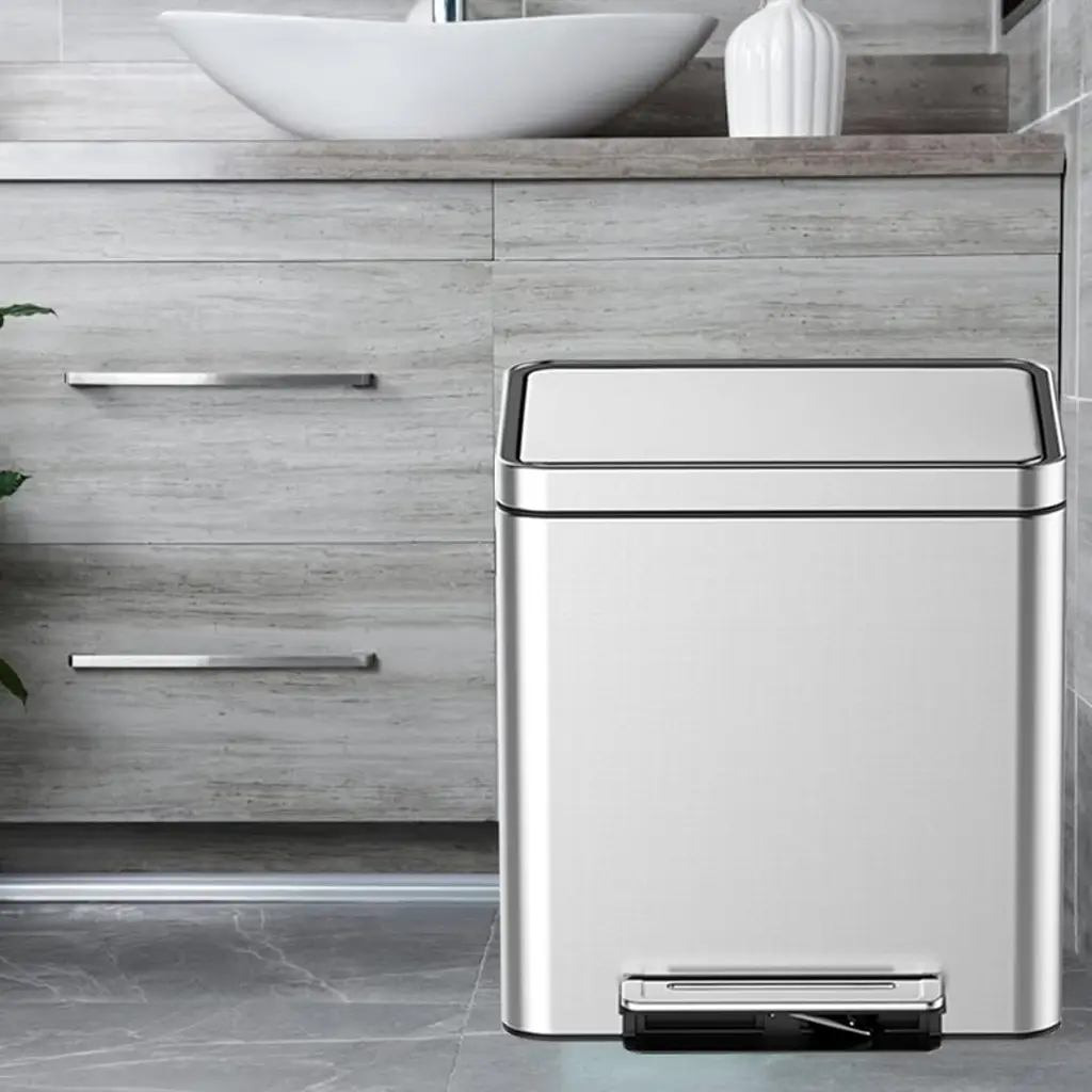 Tired of cluttered bins and messy recycling? Meet the Dual Trash Can with Recycle Bin, a brushed stainless steel powerhouse designed to streamline your kitchen while keeping it stylish. With dual compartments, a soft-close metal lid, and foot pedal convenience, this rectangular bin makes sorting trash and recycling effortless, hygienic, and space-efficient. Key Features: Material: Premium brushed stainless steel exterior + durable plastic inner buckets. Capacity: Dual 2 compartments (Total: 30L/36L/40L) – ample for daily waste. Lid: Quiet soft-close mechanism for noise-free use. Foot Pedal: Heavy-duty pedal for smooth, hands-free access. Assembly: Ready to use right out of the box – no tools needed! Perfect For: Families – Simplify recycling and reduce landfill waste. Small Kitchens – Maximize space with a compact, dual-purpose bin. Modern Homes – Sleek stainless steel elevates your kitchen’s aesthetic. Busy Households – Durable construction handles daily use with ease. Why Choose This Bin? Unlike flimsy plastic bins or single-compartment trash cans, this Dual Stainless Steel Trash Can combines functionality and style. The foot pedal ensures hygiene, the soft-close lid adds luxury, and the dual buckets make waste sorting a breeze. Plus, the stainless steel build resists rust and wipes clean in seconds – no more scrubbing!