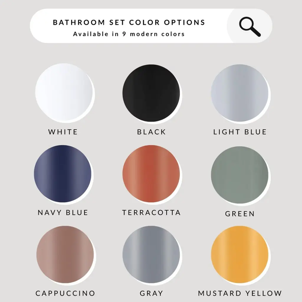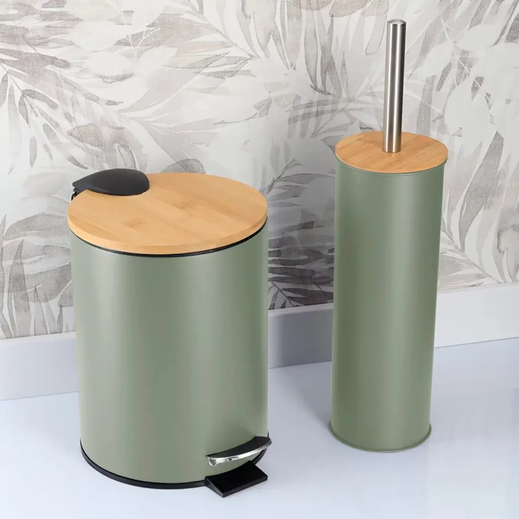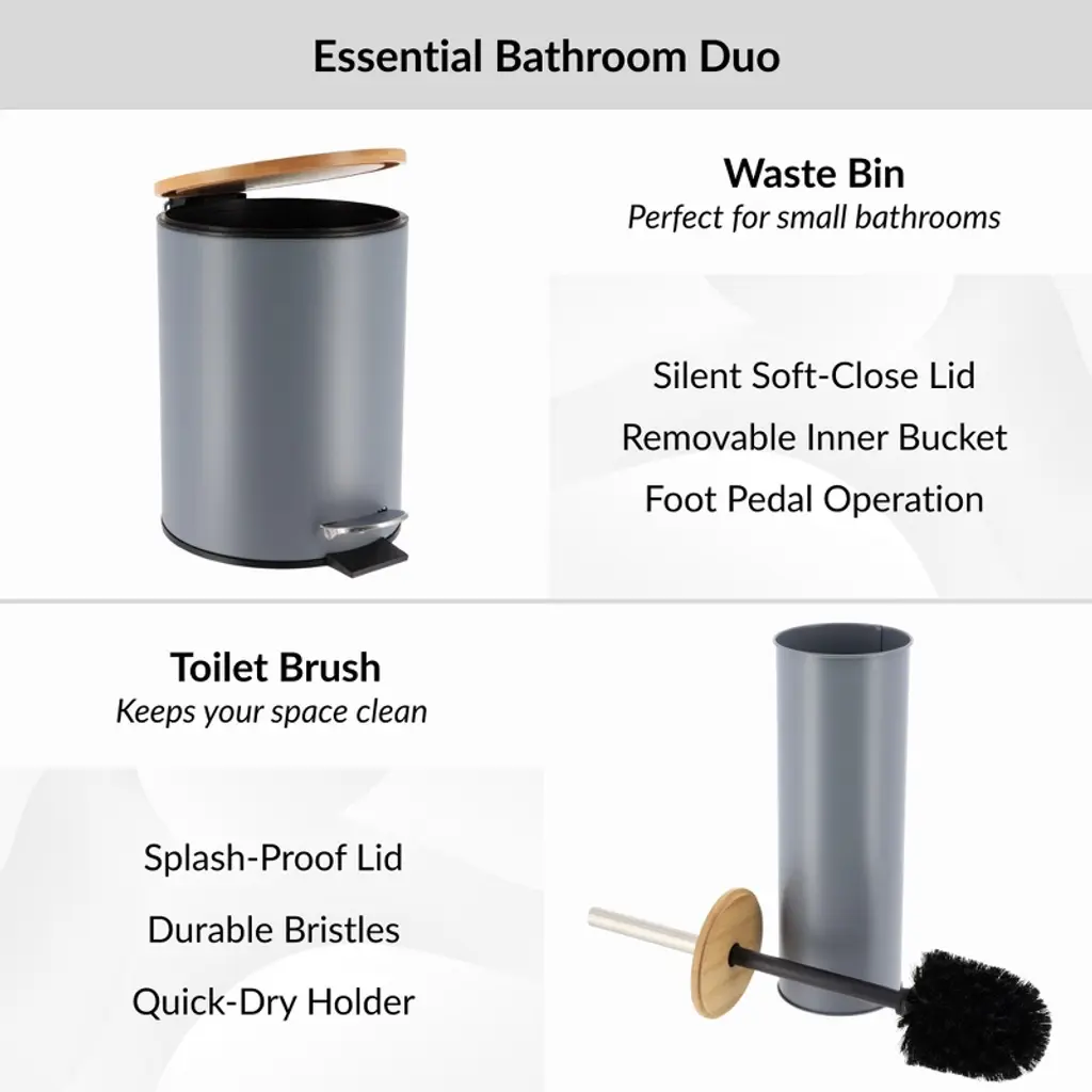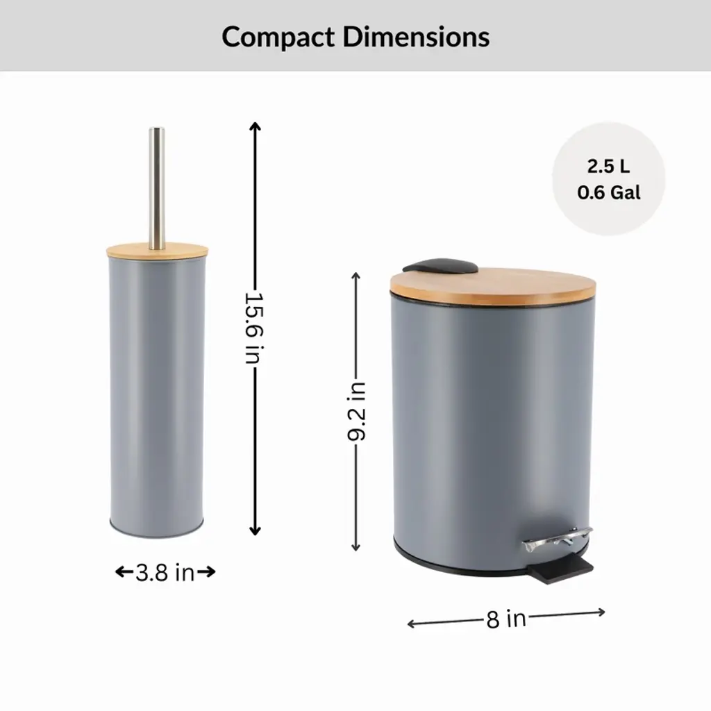 Upgrade your space with this Gray Bathroom Accessory Set featuring a toilet trash can and toilet bowl brush and holder. First, enjoy a coordinated design that brings a clean, modern look to small bathrooms, apartments or guest spaces. Next, the compact bathroom trash bin fits easily into corners or tight spaces without sacrificing function or appearance. Then, the soft-closing lid ensures silent operation, avoiding loud slams and preserving a peaceful environment. Moreover, the foot pedal allows hands-free use, keeping the process clean and hygienic. Inside, the bath trash can features a removable inner bucket for easy waste disposal and quick clean-ups. In addition, the included toilet cleaner brush comes with durable bristles that tackle stains effectively. Also, the toilet scrubber features a holder that allows quick drying and keeps bristles out of view. Plus, the anti-splash lid keeps the bathroom cleaning brush covered when not in use, for added discretion. Made from matte-finish metal, this bathroom accessories set is sturdy and resistant to daily wear. Furthermore, matching bamboo tops add warmth and elegance, perfectly blending functionality with style. Finally, this modern bathroom accessory set is available in multiple colors to match any decor. Choose these gray bathroom accessories to save space, stay organized, and elevate your bathroom with a cohesive look.