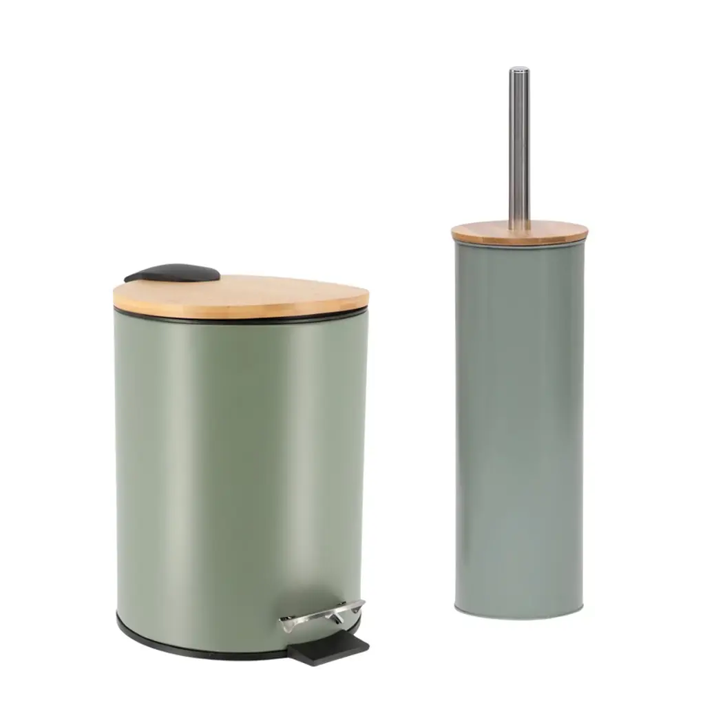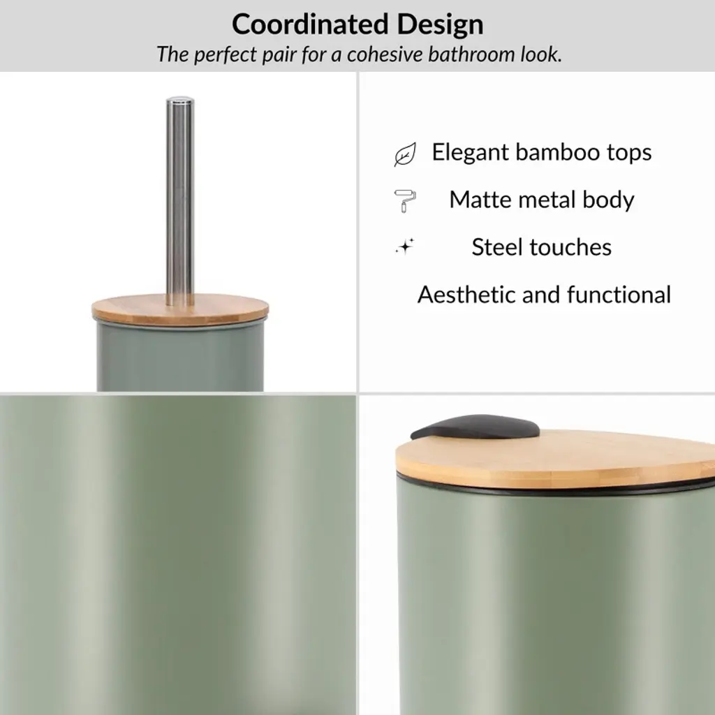 Evideco French Home Goods Green Bathroom Set With Bamboo Lid - Matte Metal Trash Can And Toilet Brush
