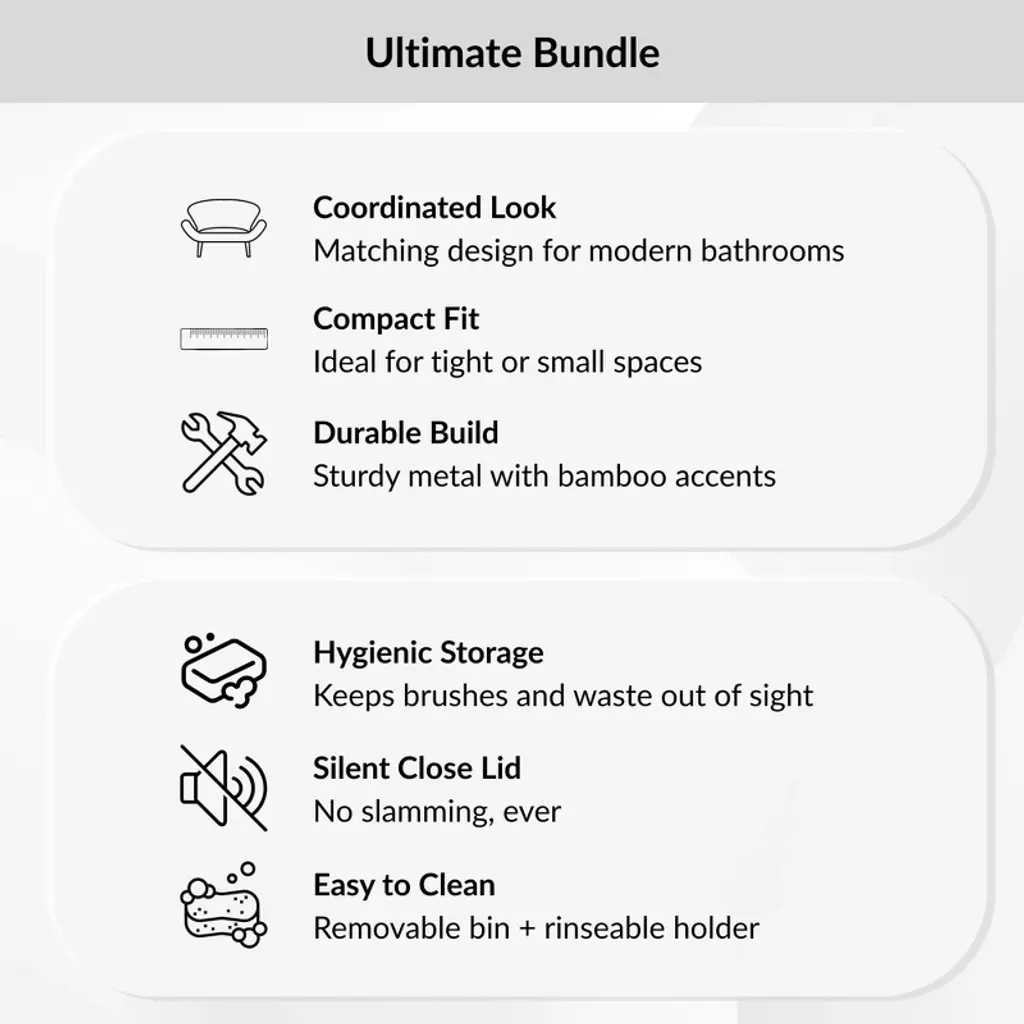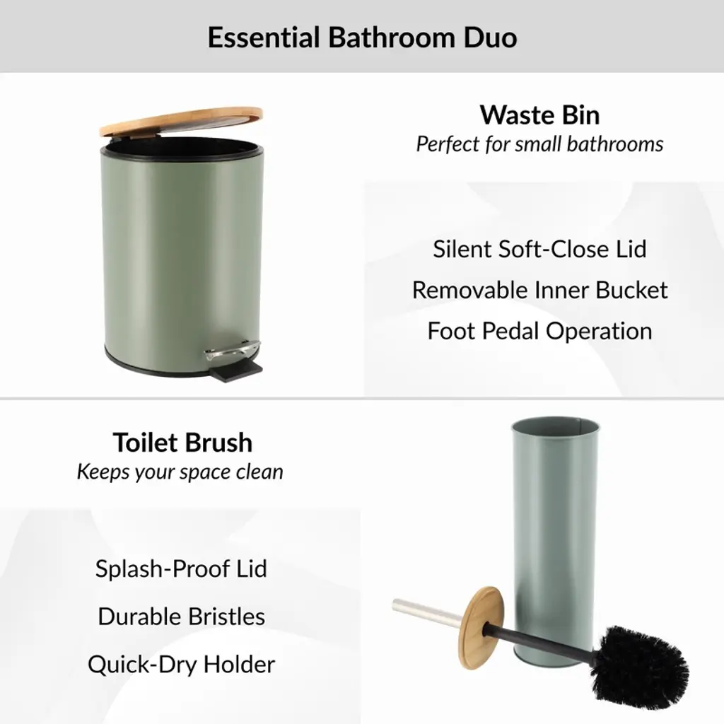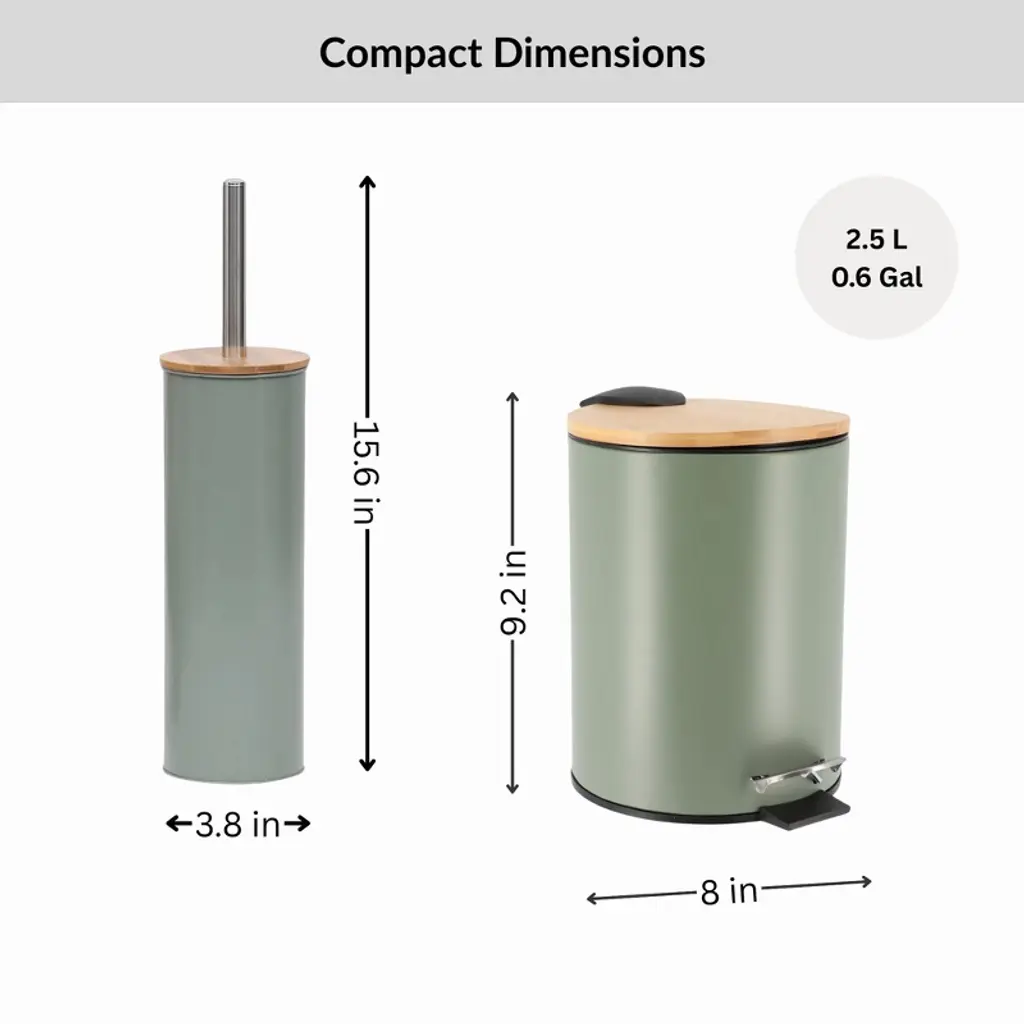 Upgrade your space with this Green Bathroom Accessory Set featuring a toilet trash can and toilet bowl brush and holder. First, enjoy a coordinated design that brings a clean, modern look to small bathrooms, apartments or guest spaces. Next, the compact bathroom trash bin fits easily into corners or tight spaces without sacrificing function or appearance. Then, the soft-closing lid ensures silent operation, avoiding loud slams and preserving a peaceful environment. Moreover, the foot pedal allows hands-free use, keeping the process clean and hygienic. Inside, the bath trash can features a removable inner bucket for easy waste disposal and quick clean-ups. In addition, the included toilet cleaner brush comes with durable bristles that tackle stains effectively. Also, the toilet scrubber features a holder that allows quick drying and keeps bristles out of view. Plus, the anti-splash lid keeps the bathroom cleaning brush covered when not in use, for added discretion. Made from matte-finish metal, this bathroom accessories set is sturdy and resistant to daily wear. Furthermore, matching bamboo tops add warmth and elegance, perfectly blending functionality with style. Finally, this modern bathroom accessory set is available in multiple colors to match any decor. Choose these green bathroom accessories to save space, stay organized, and elevate your bathroom with a cohesive look.