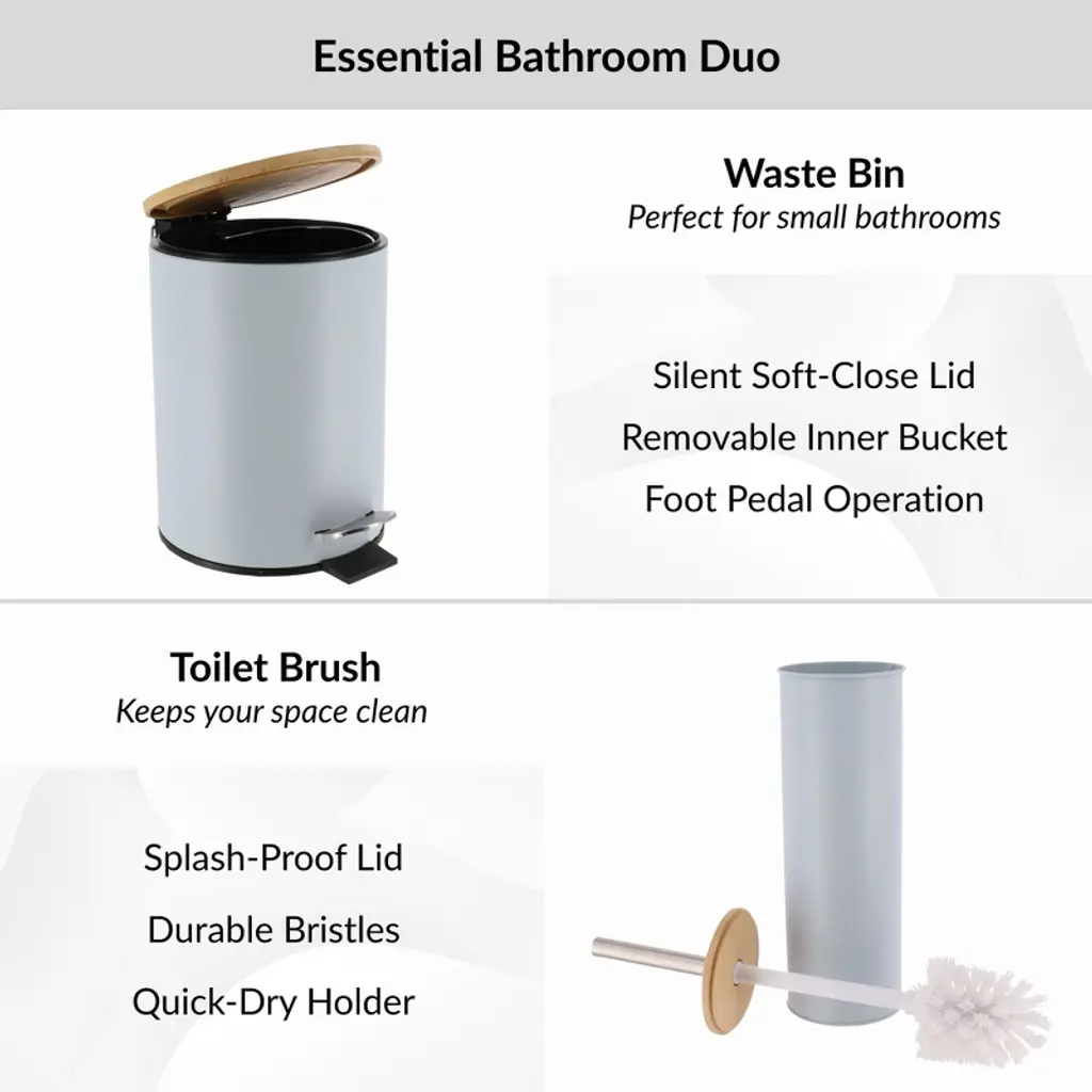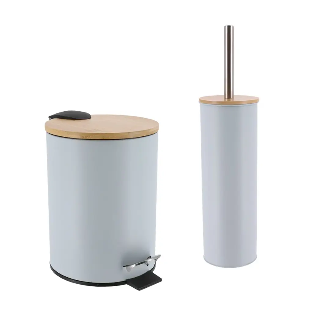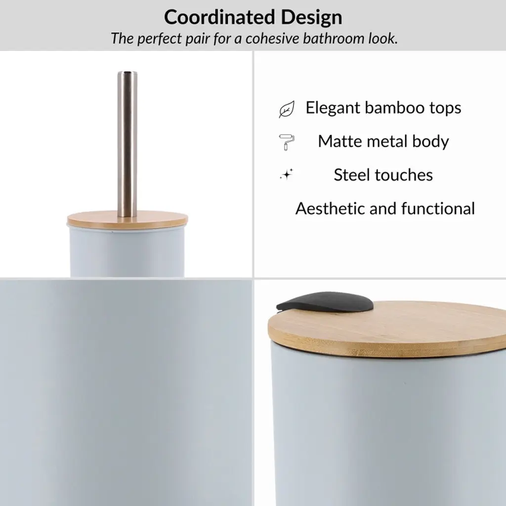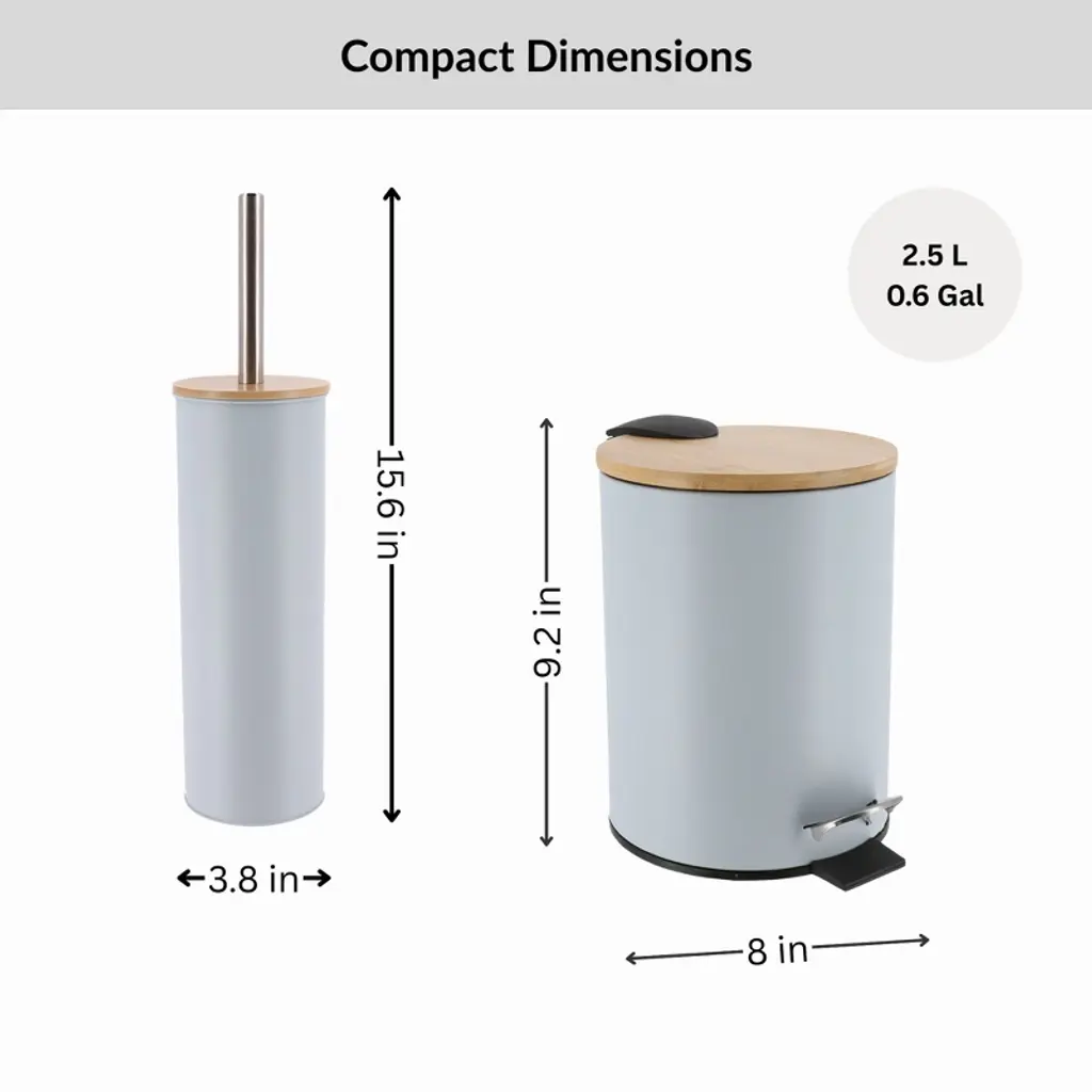 Upgrade your space with this Light Blue Bathroom Accessory Set featuring a toilet trash can and toilet bowl brush and holder. First, enjoy a coordinated design that brings a clean, modern look to small bathrooms, apartments or guest spaces. Next, the compact bathroom trash bin fits easily into corners or tight spaces without sacrificing function or appearance. Then, the soft-closing lid ensures silent operation, avoiding loud slams and preserving a peaceful environment. Moreover, the foot pedal allows hands-free use, keeping the process clean and hygienic. Inside, the bath trash can features a removable inner bucket for easy waste disposal and quick clean-ups. In addition, the included toilet cleaner brush comes with durable bristles that tackle stains effectively. Also, the toilet scrubber features a holder that allows quick drying and keeps bristles out of view. Plus, the anti-splash lid keeps the bathroom cleaning brush covered when not in use, for added discretion. Made from matte-finish metal, this bathroom accessories set is sturdy and resistant to daily wear. Furthermore, matching bamboo tops add warmth and elegance, perfectly blending functionality with style. Finally, this modern bathroom accessory set is available in multiple colors to match any decor. Choose these light blue bathroom accessories to save space, stay organized, and elevate your bathroom with a cohesive look.