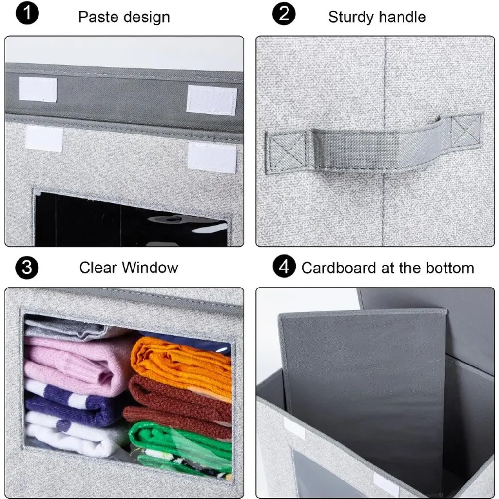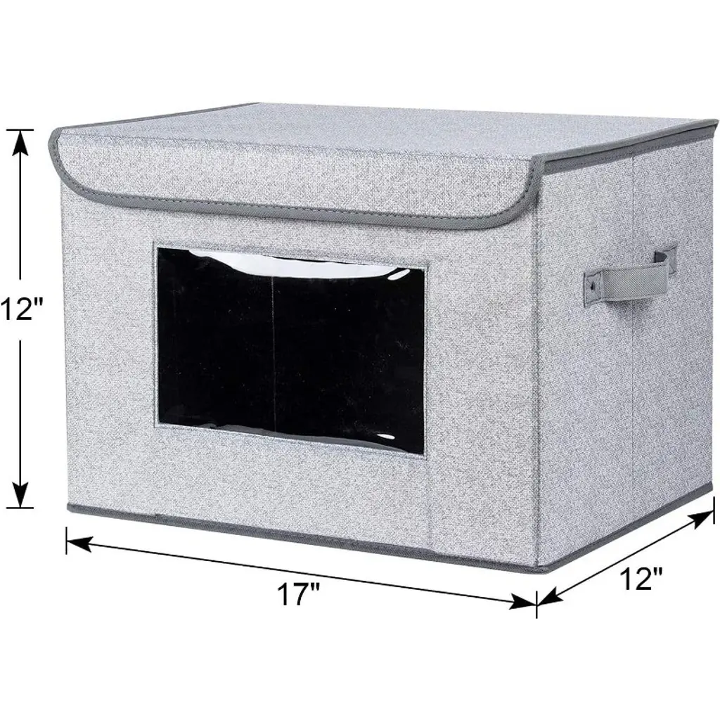 【Supportive Structure 】- This decorative storage boxes are made of thick non-woven fabrics with hard cardboard inside for the sides and bottom. The storage cube with lids won’t be deformed even full loaded. Sturdy handles in two sides makes the closet storage bins very handy for carry. 【Stackable and foldable】- It is stackable design to save your room space, and the fabric bins are foldable for easy storage. Lids in this lidded storage bins can prevent dust, make your clothes or towels always clean. 【See-through Window 】 - The clear see-through window is very user friendly for clear showing what is inside the cloth storage box, easy to organize and easy to find. 【Huge Capacity 】 - 10 Gallon / 40 liter huge capacity, size in 17 " (L) x 12" (W) x 12" (H). Can be used as storage basket, clothes storage bin. Your best choice in foldable storage cubes with lids.