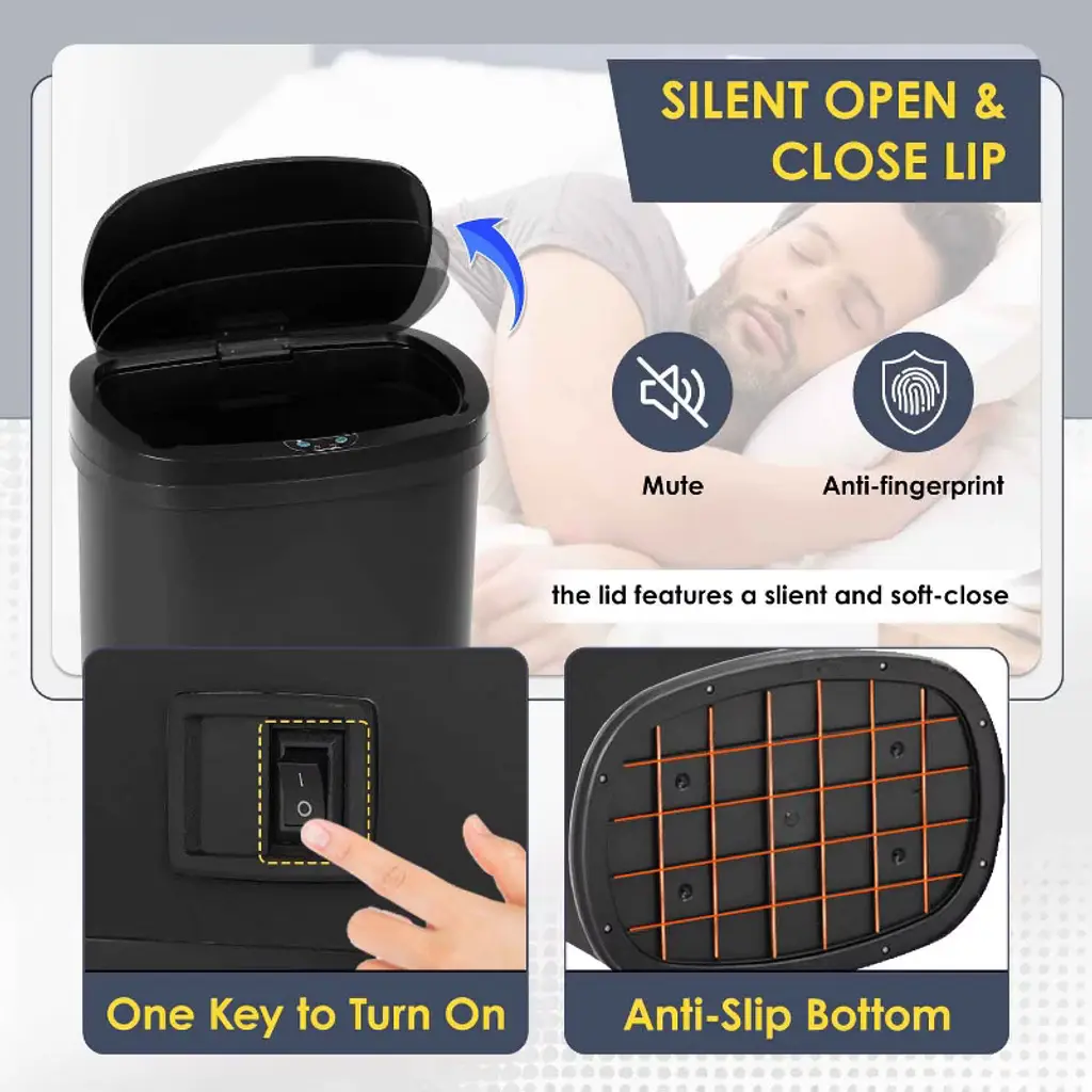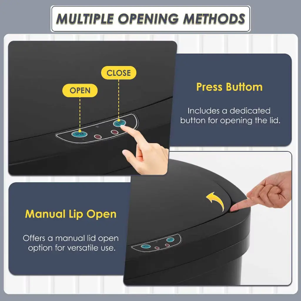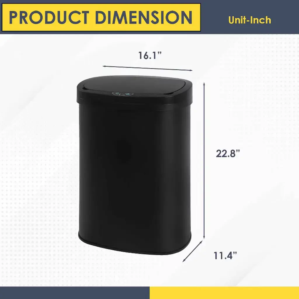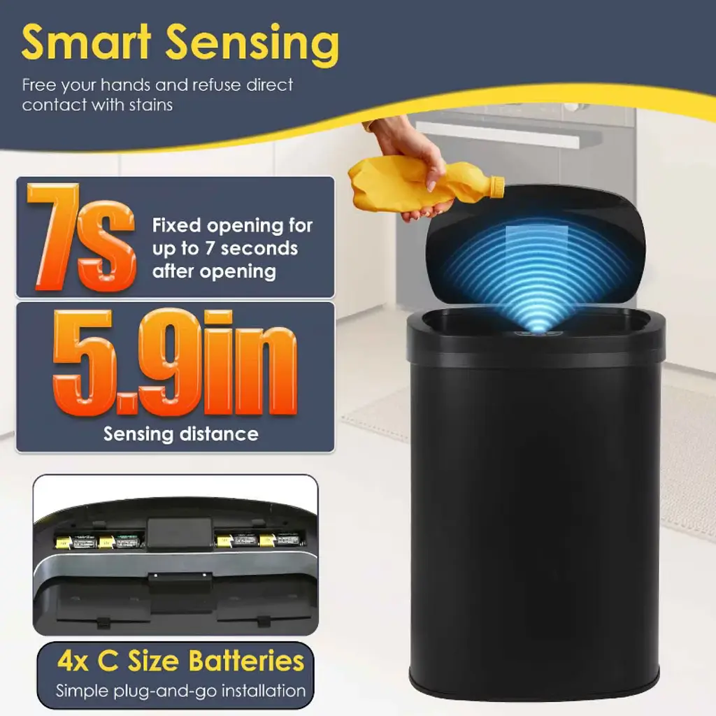 This 13-Gallon touchless trash can is a perfect trash box. With its sensible talents and sophisticated design, this garbage can makes an excellent improve for any kitchen decor. With the equipped infrared technology, this kitchen bin help keep cooking and eating regions easy and smelling sparkling. 5.9" above the infrared panel, the lid will open mechanically Press the manual button OPEN on the manipulate panel, the lid will open all the time, press CLOSE, then it's going to close. Features: Brand New, Fingerprint-resistant brushed chrome steel 13-Gallon Automatic Stainless-Steel Trash Can On/off button and an open close button for whilst you need the lid to stays open and sensor off Anti-fingerprint business grade chrome steel, high-quality for kitchen, workplace, residing room and bedroom. The battery model required for the lid needs to be selected according to the problem tips in the lid (not covered)