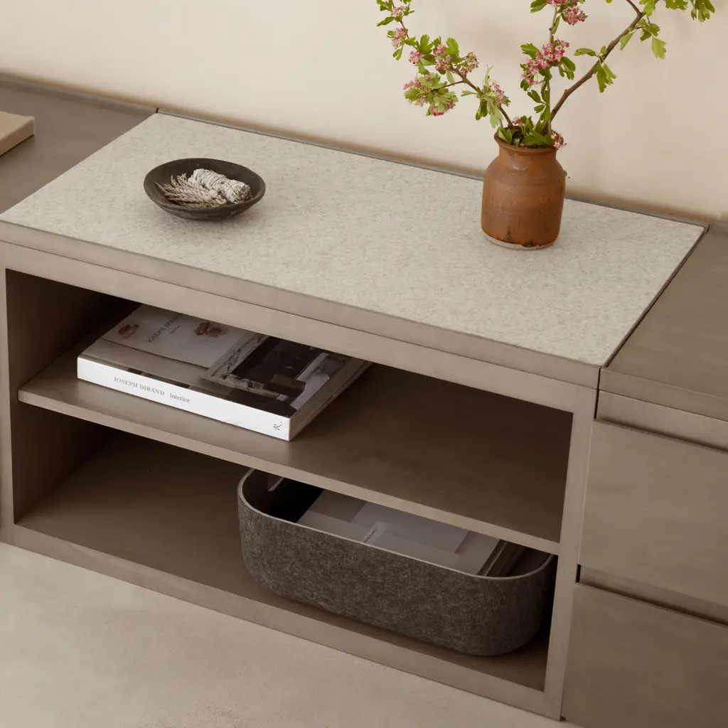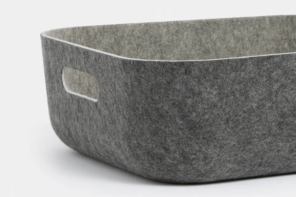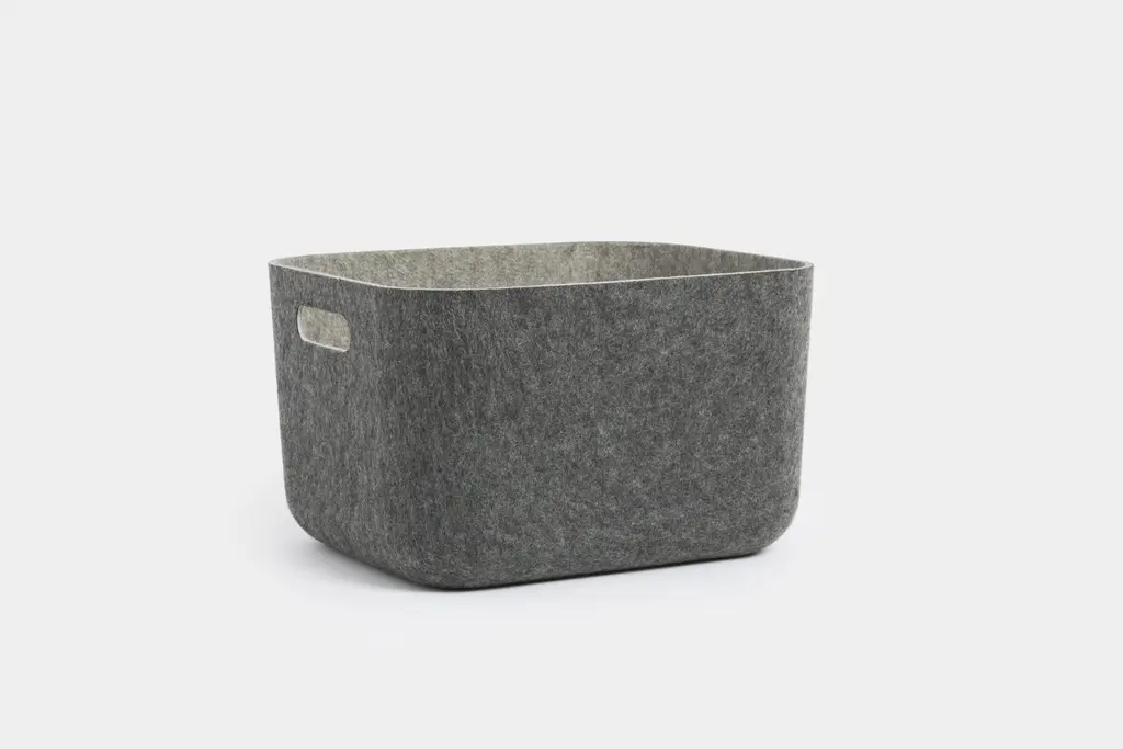 Simple, yet impactful, Felt Bins are an intuitive and versatile organization solution to be used throughout the home. Sturdy and structured design, with a smooth, understated shape. Subtle contrasting interior and cut handles for unobtrusive functionality. Crafted from recycled PET felt. Felt Bins are designed to seamlessly integrate with Thuma pieces that feature shelves or open-air space. The Medium Bin is compatible with: Nest Credenza Nest Shelving Nest Nightstand Open The Large Bin is compatible with: Nest Credenza Nest Shelving Pillar Bookshelf Classic Nightstand