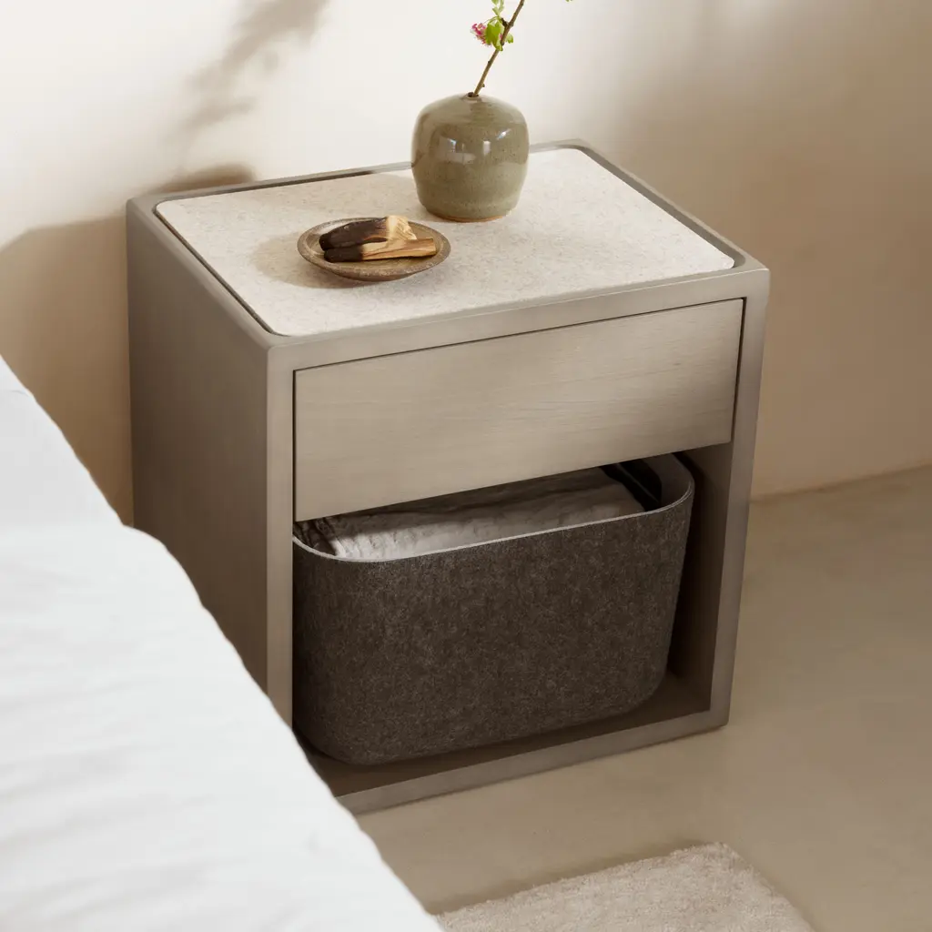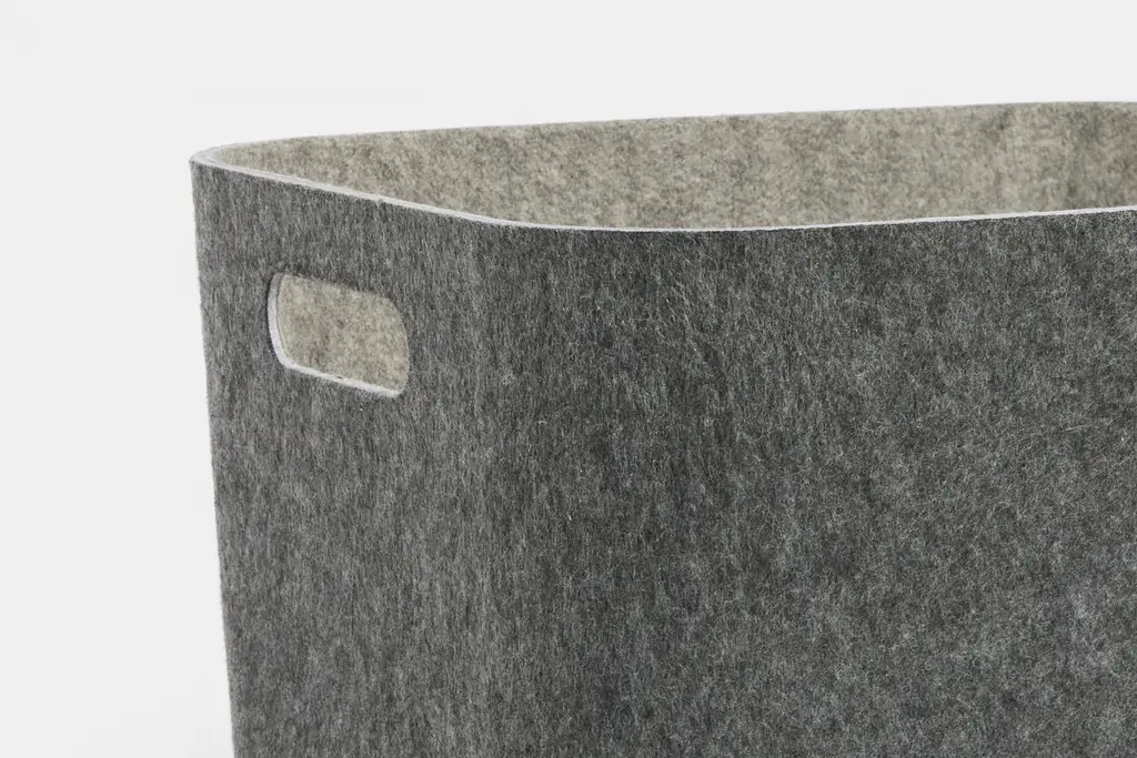 Simple, yet impactful, Felt Bins are an intuitive and versatile organization solution to be used throughout the home. Sturdy and structured design, with a smooth, understated shape. Subtle contrasting interior and cut handles for unobtrusive functionality. Crafted from recycled PET felt. Felt Bins are designed to seamlessly integrate with Thuma pieces that feature shelves or open-air space. The Medium Bin is compatible with: Nest Credenza Nest Shelving Nest Nightstand Open The Large Bin is compatible with: Nest Credenza Nest Shelving Pillar Bookshelf Classic Nightstand