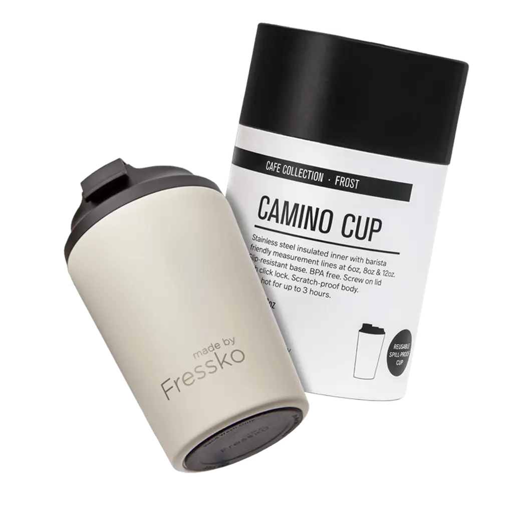 Simply the world's best reusable coffee cup. Often imitated never copied, the world-renowned original Fressko coffee cup is destined to become a trusted and stylish addition to your everyday carry. Say no to excessive waste and yes to sipping more sustainably today, tomorrow and forever.Features:Stays hot for up to 3 hours, depending on use.Insulated for cold drinks, too.Easy clean, no fuss, click back lid.Internal Barista lines.Fits under standard coffee machines.Fits in a standard car cup holder.Ideal for travel.Sip hot beverages safely around young children.The outer stays cool to the touch.Compatible with the Fressko Leather Sleeve, for extra comfort.