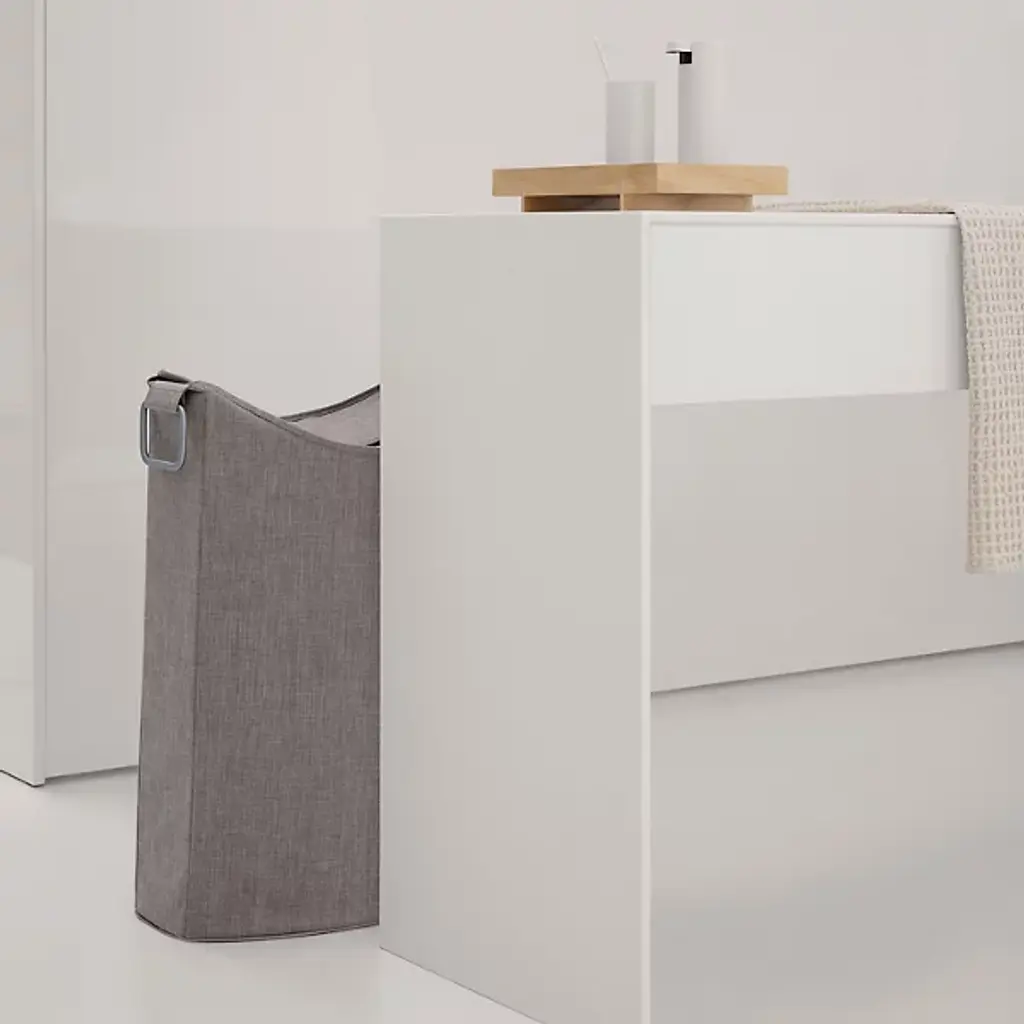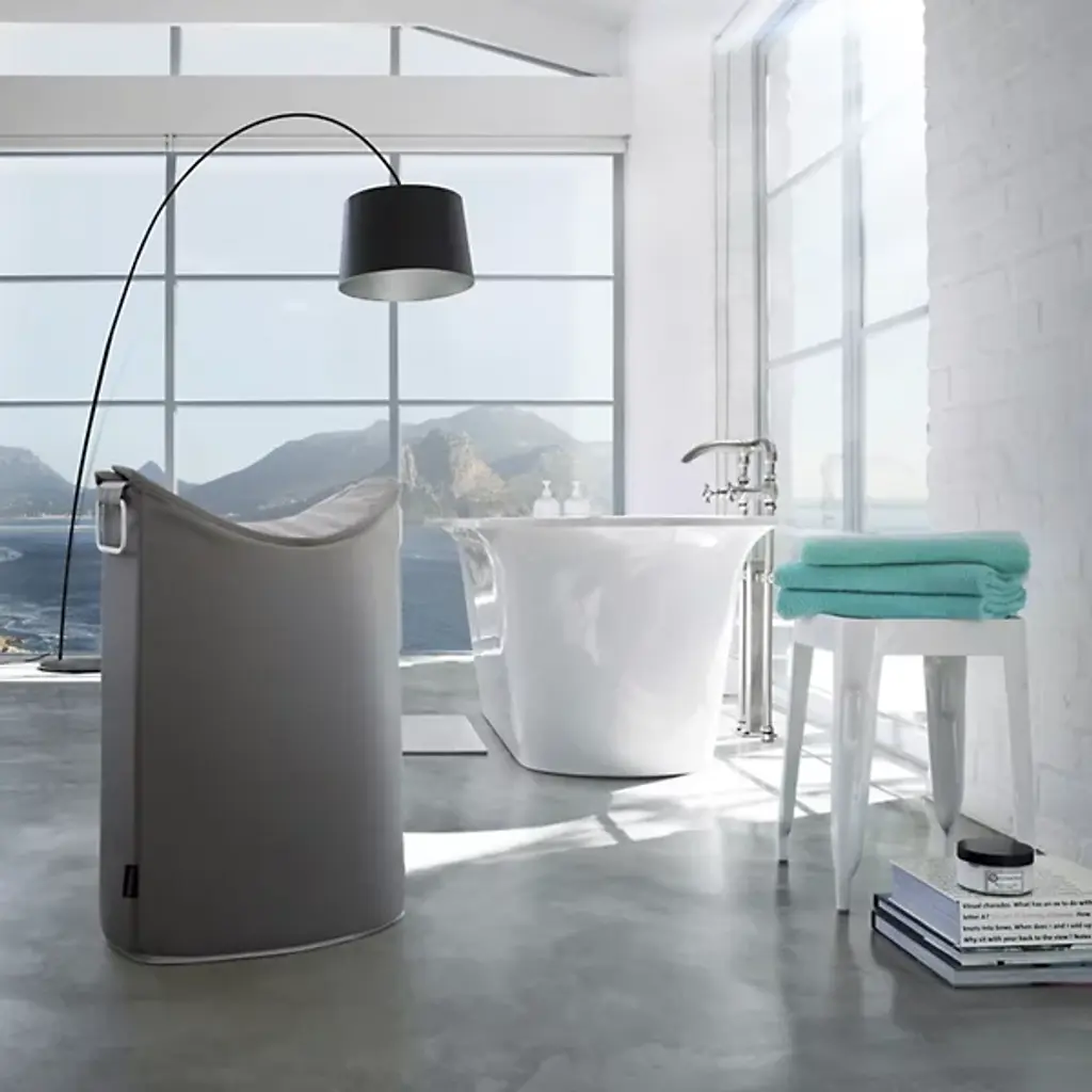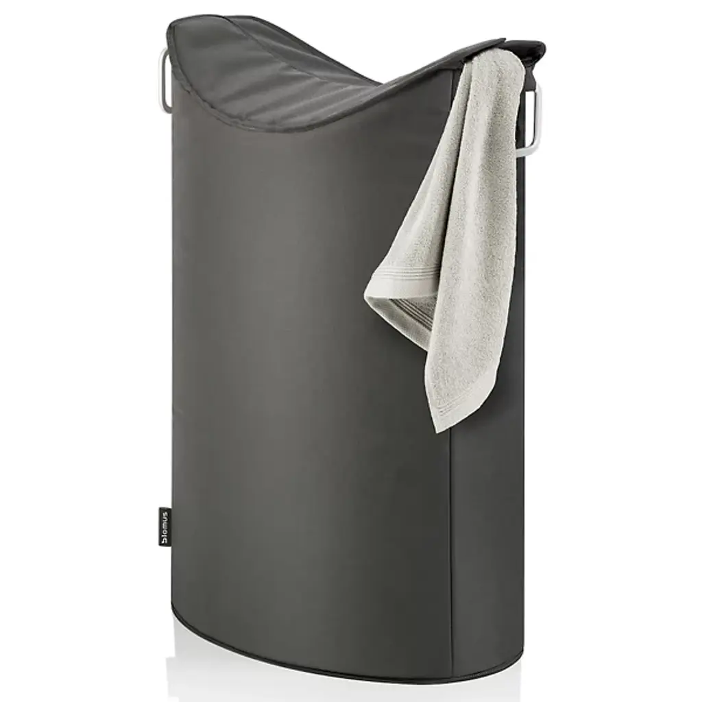 The Blomus FRISCO Laundry Bin has a slim shape and sleek modern style that will allow it to fit in just about any bathroom, bedroom or closet. It is an elliptical bin made out of synthetic fiber, with aluminum handles for easy carrying. The top folds closed (but is still easily opened) to keep dirty laundry out of sight.