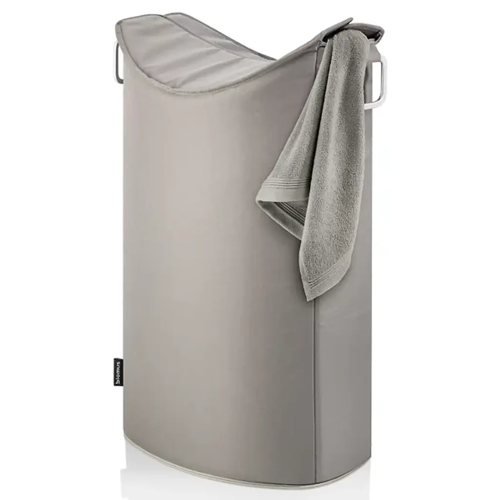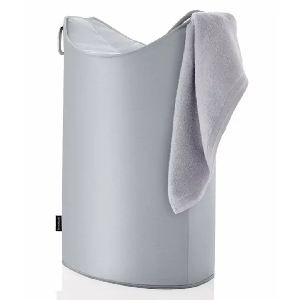 The Blomus FRISCO Laundry Bin has a slim shape and sleek modern style that will allow it to fit in just about any bathroom, bedroom or closet. It is an elliptical bin made out of synthetic fiber, with aluminum handles for easy carrying. The top folds closed (but is still easily opened) to keep dirty laundry out of sight.