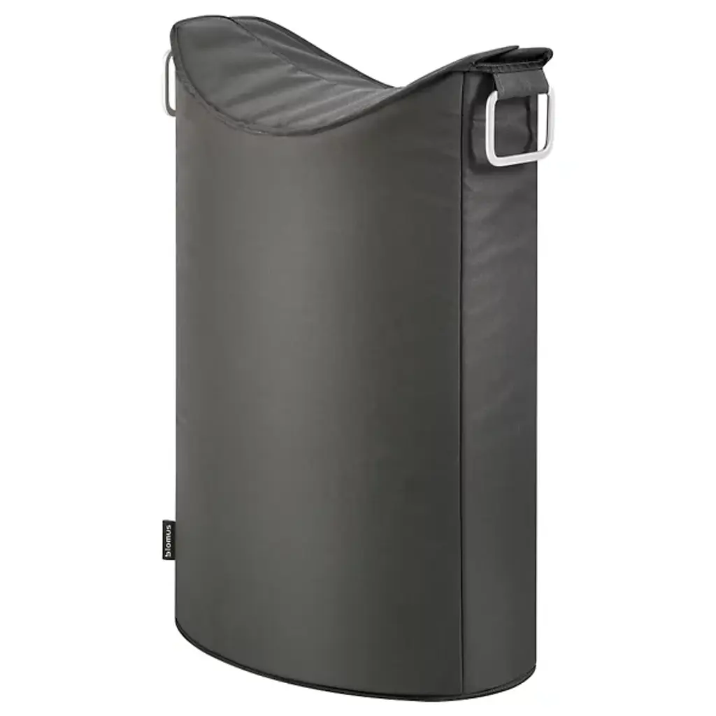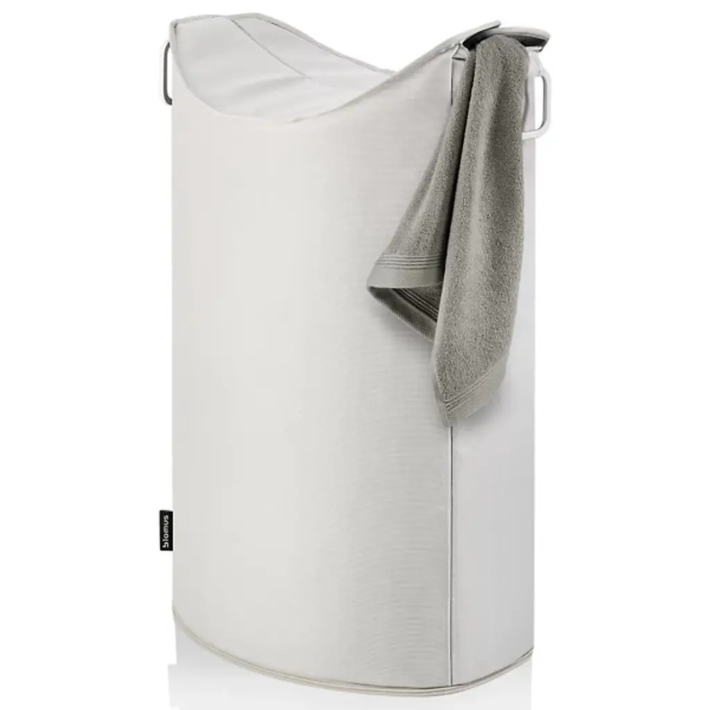 The Blomus FRISCO Laundry Bin has a slim shape and sleek modern style that will allow it to fit in just about any bathroom, bedroom or closet. It is an elliptical bin made out of synthetic fiber, with aluminum handles for easy carrying. The top folds closed (but is still easily opened) to keep dirty laundry out of sight.