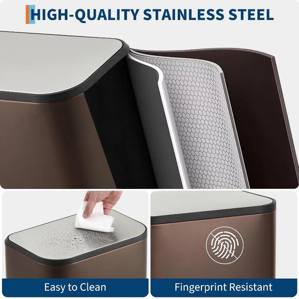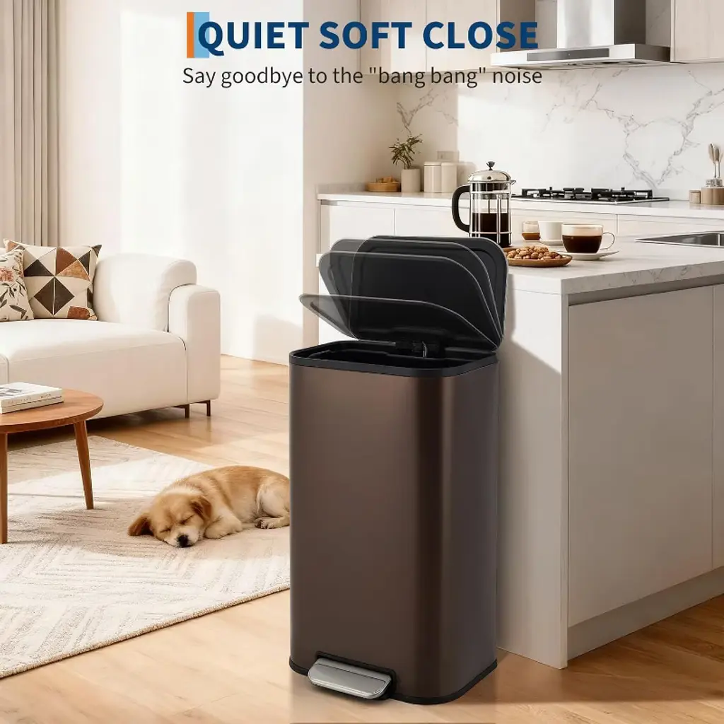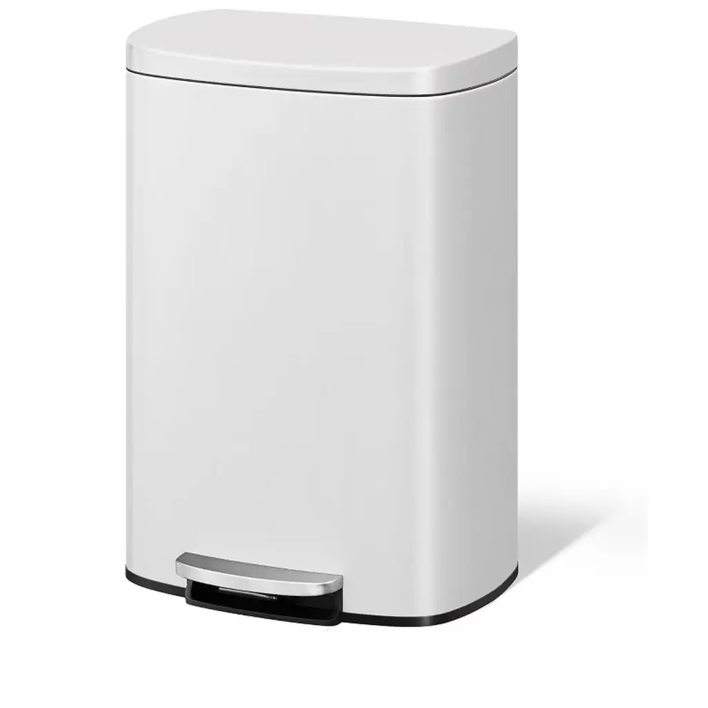 This matte white stainless steel trash can merges minimalist sophistication with whisper-quiet functionality, featuring a sleek rectangular silhouette and durable fingerprint-resistant powder-coated finish that elevates modern kitchens, offices, or bedrooms while resisting scratches and smudges. The silent soft-close lid operates with library-quiet precision, eliminating disruptive slams, while the ergonomic foot pedal enables effortless, hands-free opening—ideal for users of all heights seeking hygienic waste disposal. Generous capacity effortlessly handles daily household trash, complemented by a removable inner bucket for swift, mess-free cleaning and odor containment. Designed for seamless integration into compact spaces, its space-efficient footprint and refined aesthetic transform mundane disposal into a silent ritual of elegance and practicality.