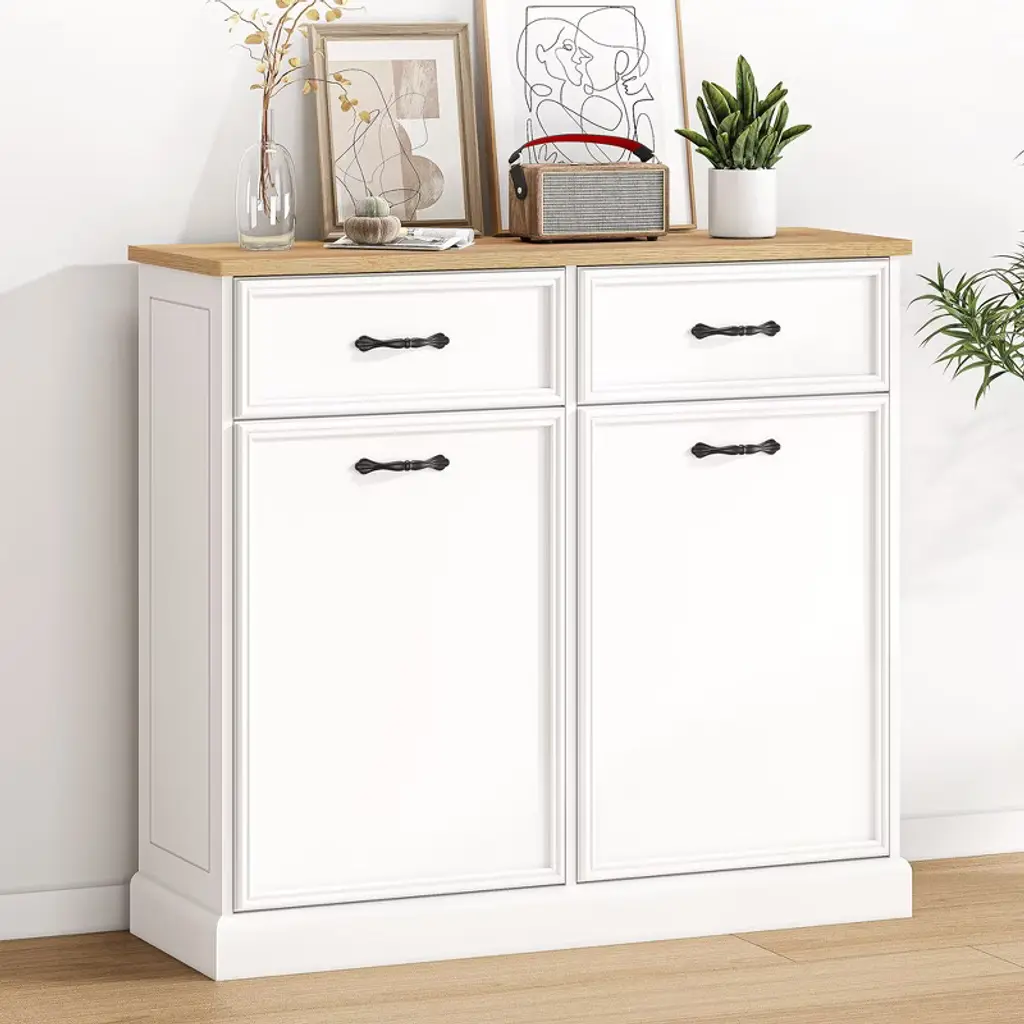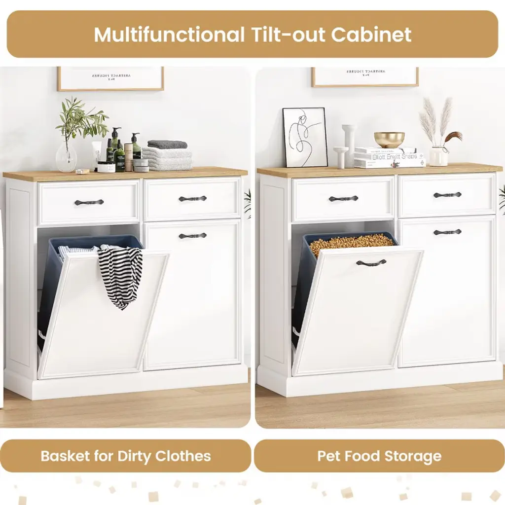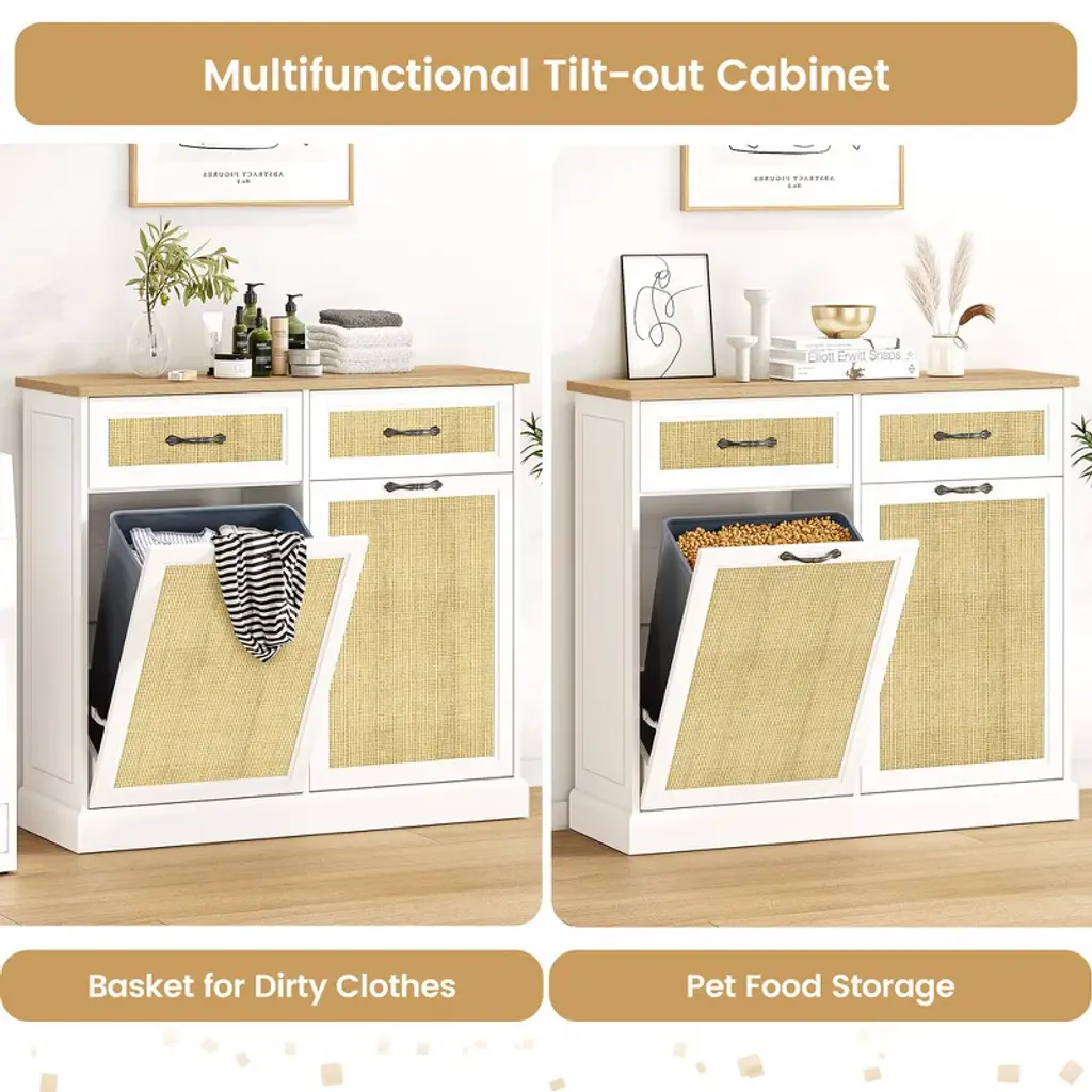 Garvee Double Tilt Out Trash Cabinet With Natural Rattan, Hidden Trash Can Cabinet 10 Gallon Storage Holder For Kitchen Dining Living Room, White