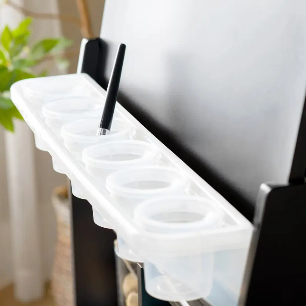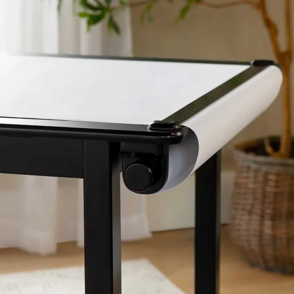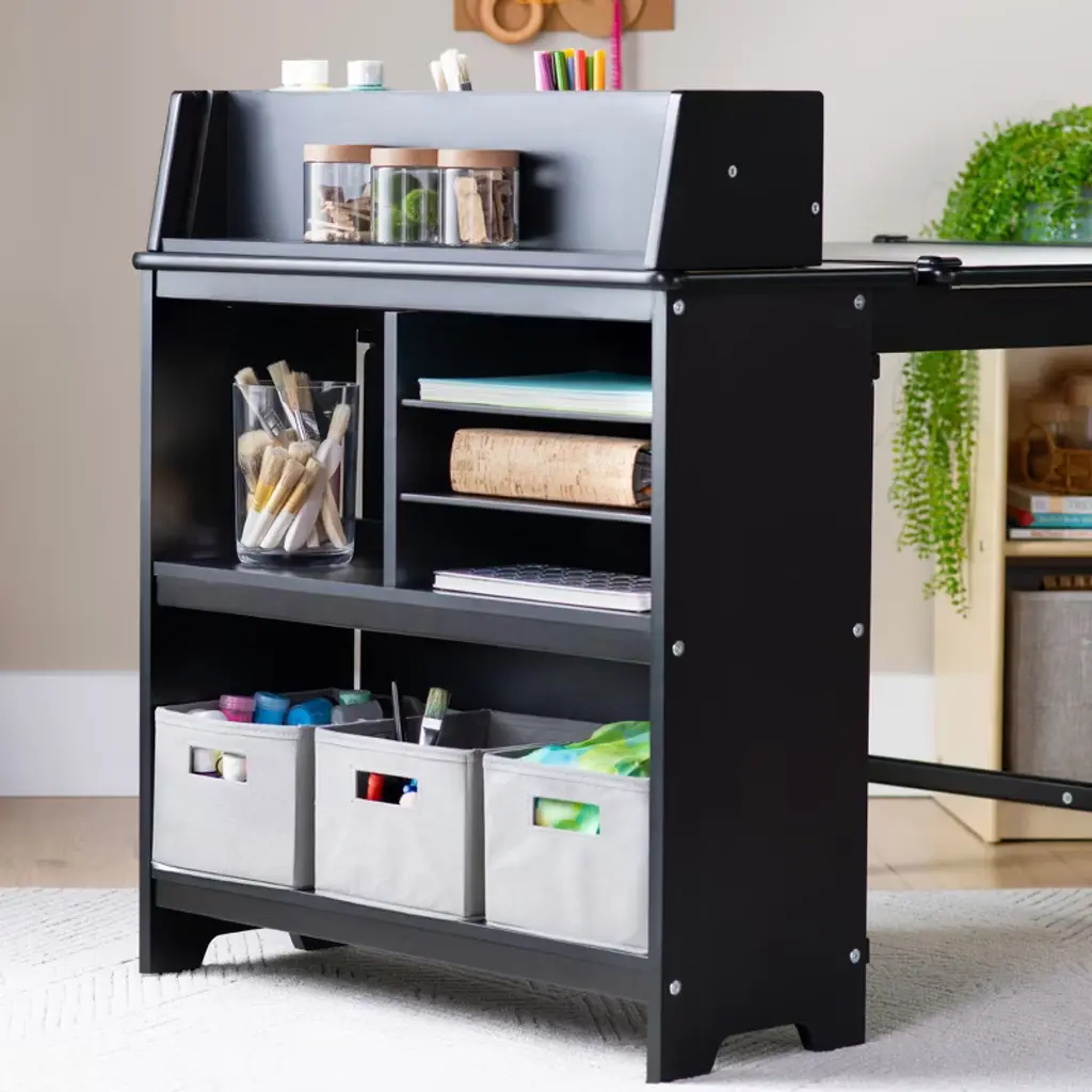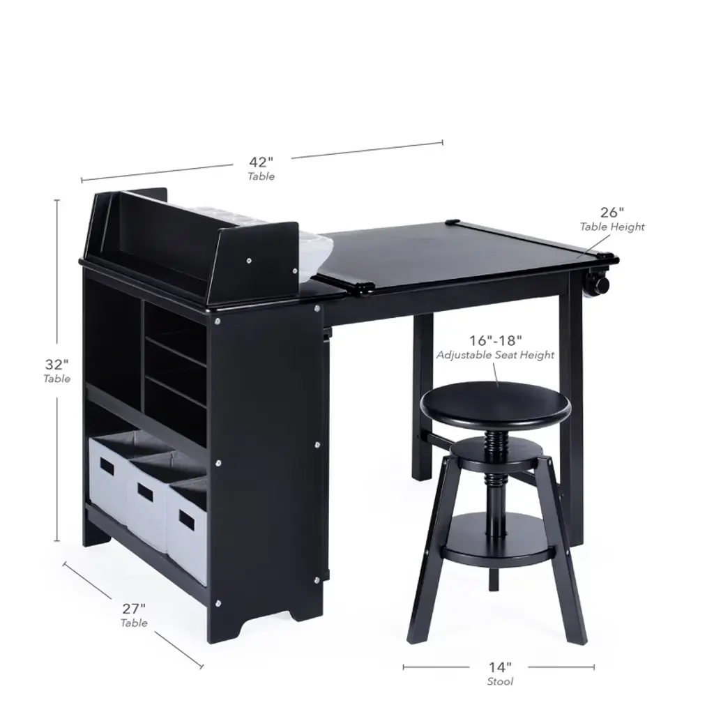 Imagine an art table, drafting table, activity table, and easel all combined into one thoughtfully designed art studio that adapts to the way children sit, stand, lean, and interact with materials while making art. Introducing the Guidecraft Design Studio, a first-of-its-kind art studio for children ages 3 through 8 built to last with a sturdy design that stands up to years of creativity and everyday use. The main feature: a spacious flat activity table that is perfect for doing homework, drawing, crafting, eating and other activities angles up & transforms into a drafting table! A slow-close pneumatic hinge and safety cleat provide smooth adjustments and a secure lock, giving young artists the freedom to find their best creative angle with ease and confidence. The art easel brings even more functionality to the studio, featuring a two-sided design with paper-holding clips on one side and a black chalkboard on the other. When not in use, it slides away under the table to keep the space open & organized. The Design Studio coordinates with an adjustable Drafting Stool which allows children to adjust to their height & style of seating (sold separately). Not just that the art studio is packed with smart storage solutions to keep art supplies within reach, including cubby shelves, three fabric bins, an art caddy, and a paint tray with removable cups that move seamlessly between the activity table and art easel. This multi-use art table accommodates up to three children at once, making it perfect for collaborative art sessions. Available in white, black, and natural finishes, the Design Studio is a stylish and versatile addition to any home, classroom, or creative space for children. Measures 42"W x 27"D x 26"H .