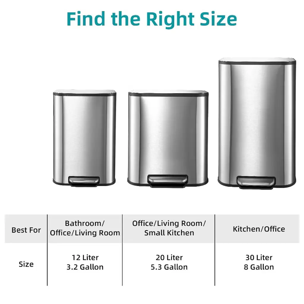 This fingerprint-proof stainless steel trash can pairs a removable, bag-secure inner bucket with a hands-free foot pedal, soft-close lid, non-skid base, and carrying handle for quiet, hygienic, and easily portable waste disposal.