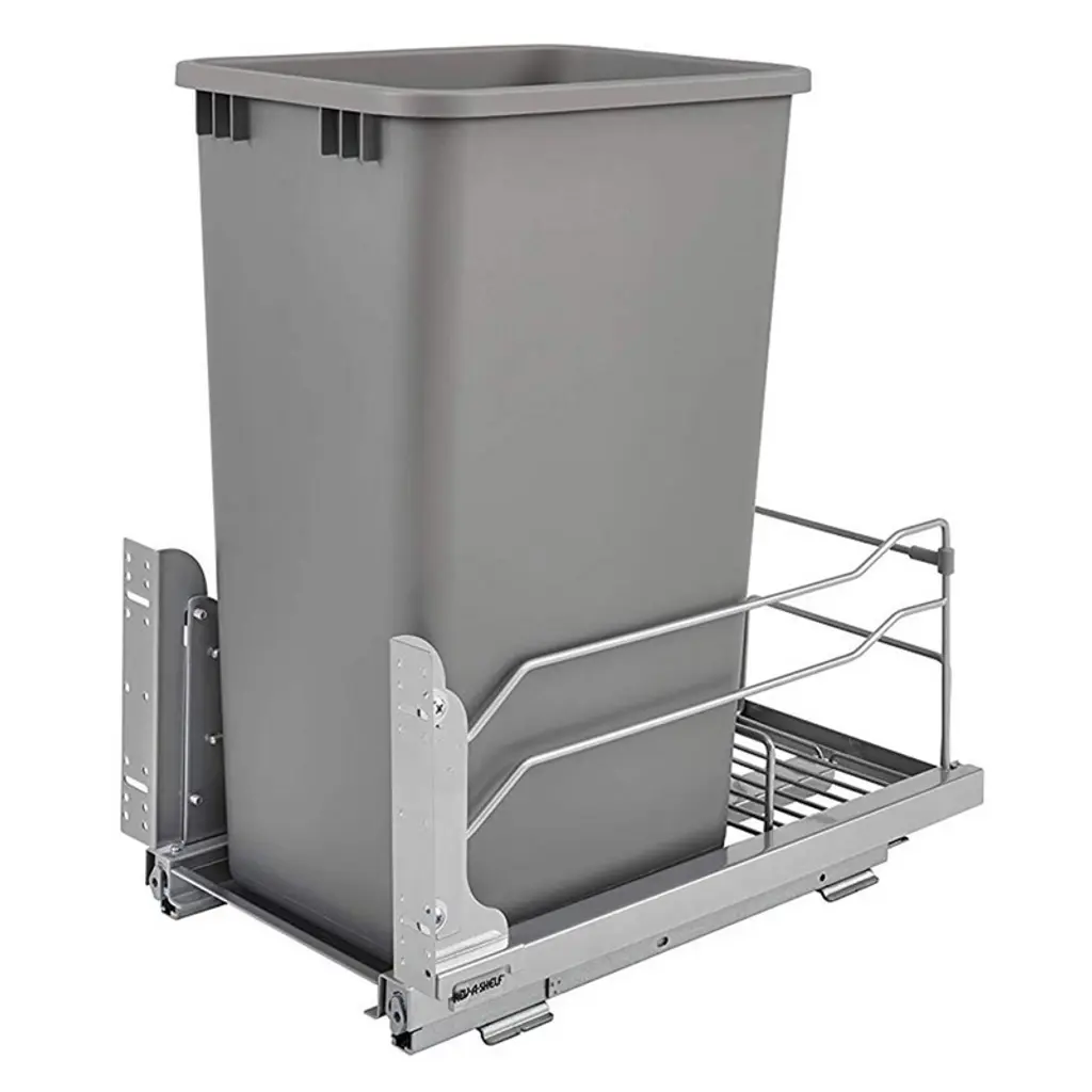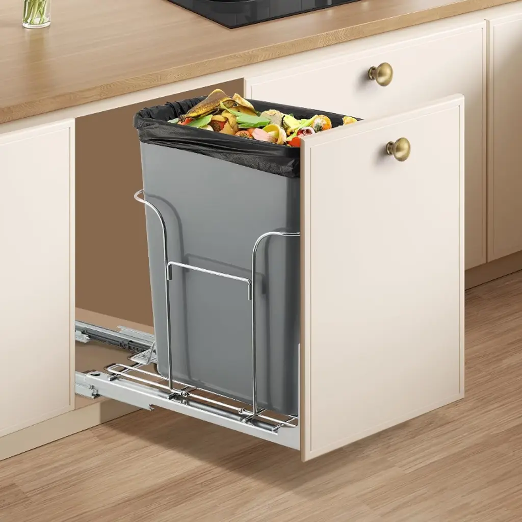 This Space-Saving Under-Cabinet Pull-Out System Features Dual Bins For Eco-Friendly Waste Management, Is Crafted For Easy Cleaning With A 100lb Capacity, And Operates Quietly On A Smooth Ball-Bearing Slide System With A Stylish Modern Design.