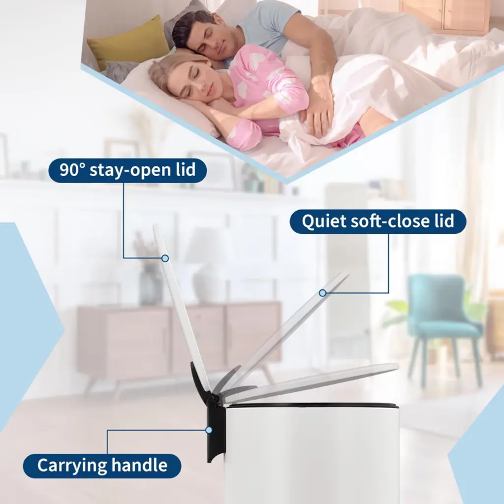 This 8-gallon trash can features a removable inner bucket that effectively prevents liquid leaks and simplifies waste disposal. Simply pull out the bucket for easy emptying, keeping the trash can clean and making your waste management routine a breeze. Designed with a foot pedal, this lidded bathroom trash can allows for easy lid operation without touching the can. This ensures a hygienic waste disposal experience, making it perfect for maintaining cleanliness in busy household areas. This round kitchen garbage bin is equipped with advanced slow-close technology, enabling the lid to open and close quietly. Enjoy a peaceful and efficient waste disposal experience that minimizes noise while perfectly blending into your stylish modern kitchen.