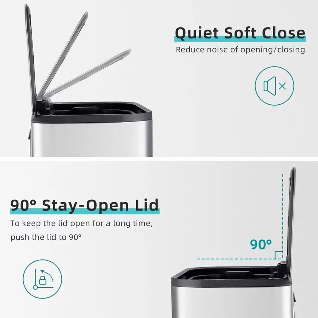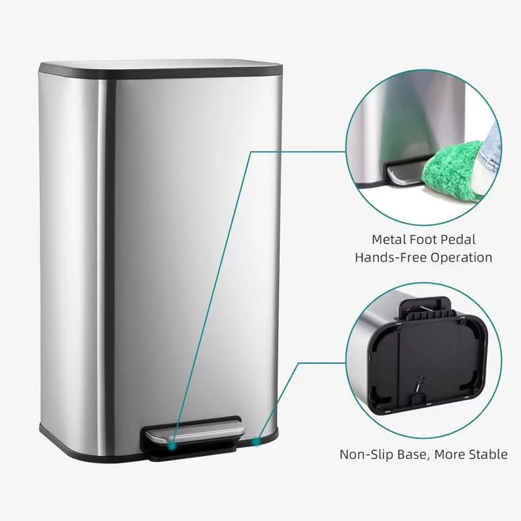 This fingerprint-proof stainless steel trash can pairs a removable, bag-secure inner bucket with a hands-free foot pedal, soft-close lid, non-skid base, and carrying handle for quiet, hygienic, and easily portable waste disposal.