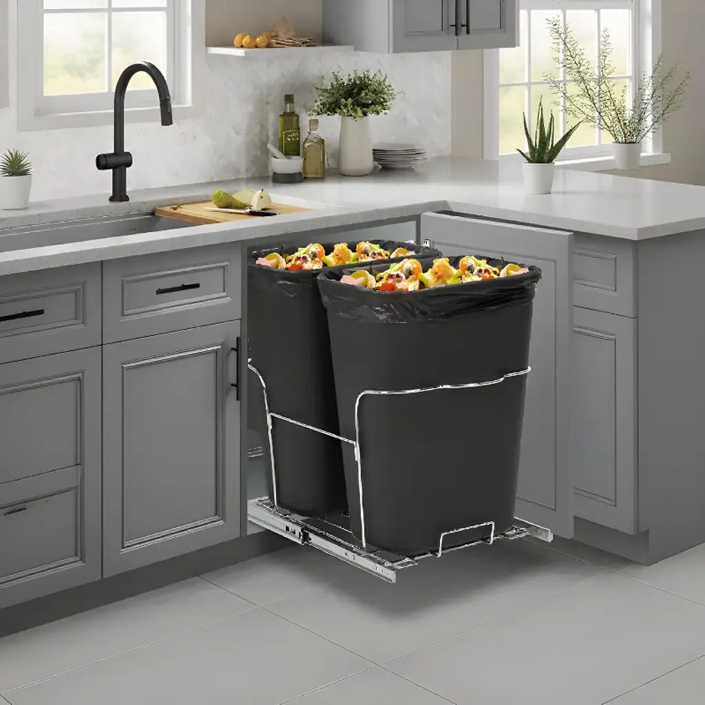 This Under-Cabinet Dual-Bin Pullout Trash Can Features Two 35qt Bins For Sorting Waste And Recyclables, Is Built With Durable Slides For Easy Access, And Includes Hardware For Straightforward Installation.
