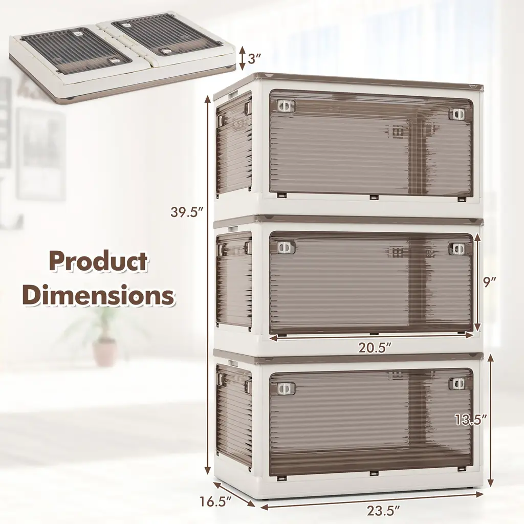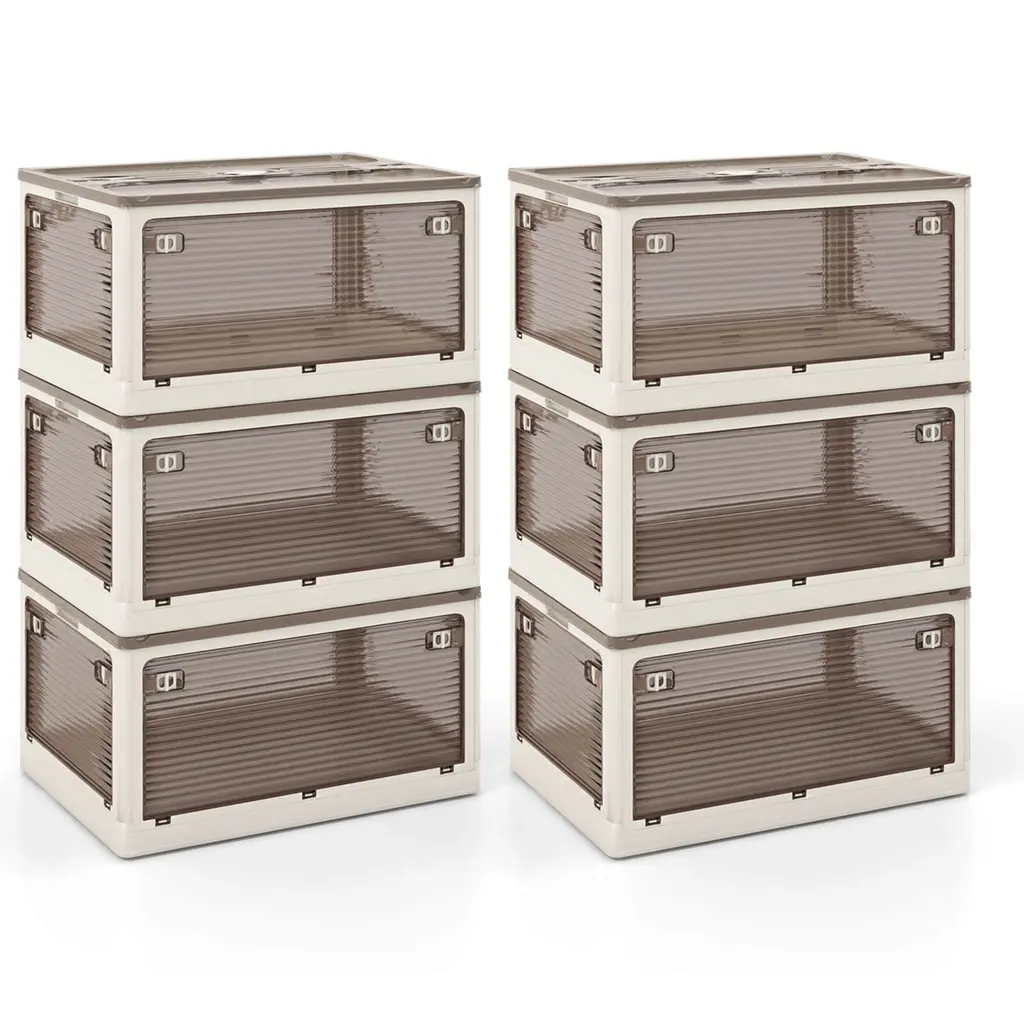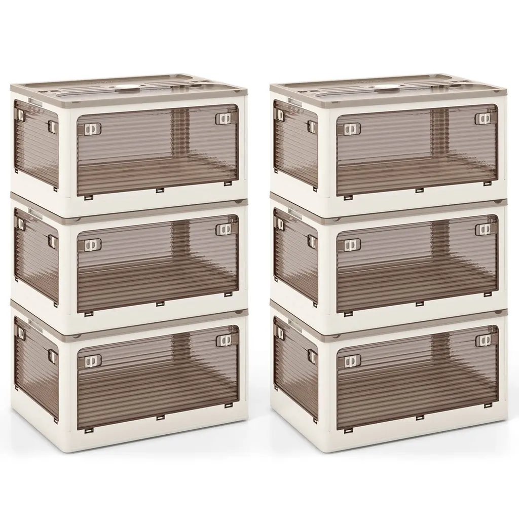 Discover the perfect home organization solution! This 6-pack storage bin set is a game-changer, offering a whopping 24-gallon capacity combined! Perfect for stashing everything from winter wear to sports gear, it simplifies organization with 5 convenient access points, including a smart desiccant compartment to keep contents fresh. No tools? No problem! Set up is a breeze with our foldable, ready-to-go design. Maximizing your space? Stack them up or spread them out - however you like! Plus, moving them around is smooth and effortless with built-in wheels and handles. Click now to transform clutter into a tidy haven with our versatile storage bins!Features:Large capacity for linen, snacks, books and even shoes 5 opening ways offer easy access to the items inside Tool-free assembly saves you time and effort Collapsible bins can be folded when not in use Stackable design allows you to combine the boxes as neededColor: Cream White + Clear Brown Material: PP, HIPS Dimensions of Each Bin: 18.5'' x 14'' x 9.5'' (L x W x H) Height of 3 Stacked Bins: 28'' Dimensions of Folded Bin: 18.5'' x 14'' x 3'' (L x W x H) Dimensions of Front Door: 16'' x 5.5'' (L x W) Capacity of Each Bin: 8 Gal Total Capacity: 24 Gal Load Capacity: 165 lbs Net Weight: 22 lbs Package Includes: 6 x Storage Bins 2 x User's Manual