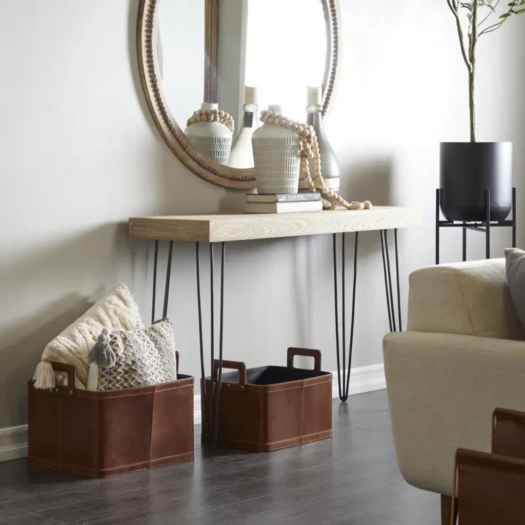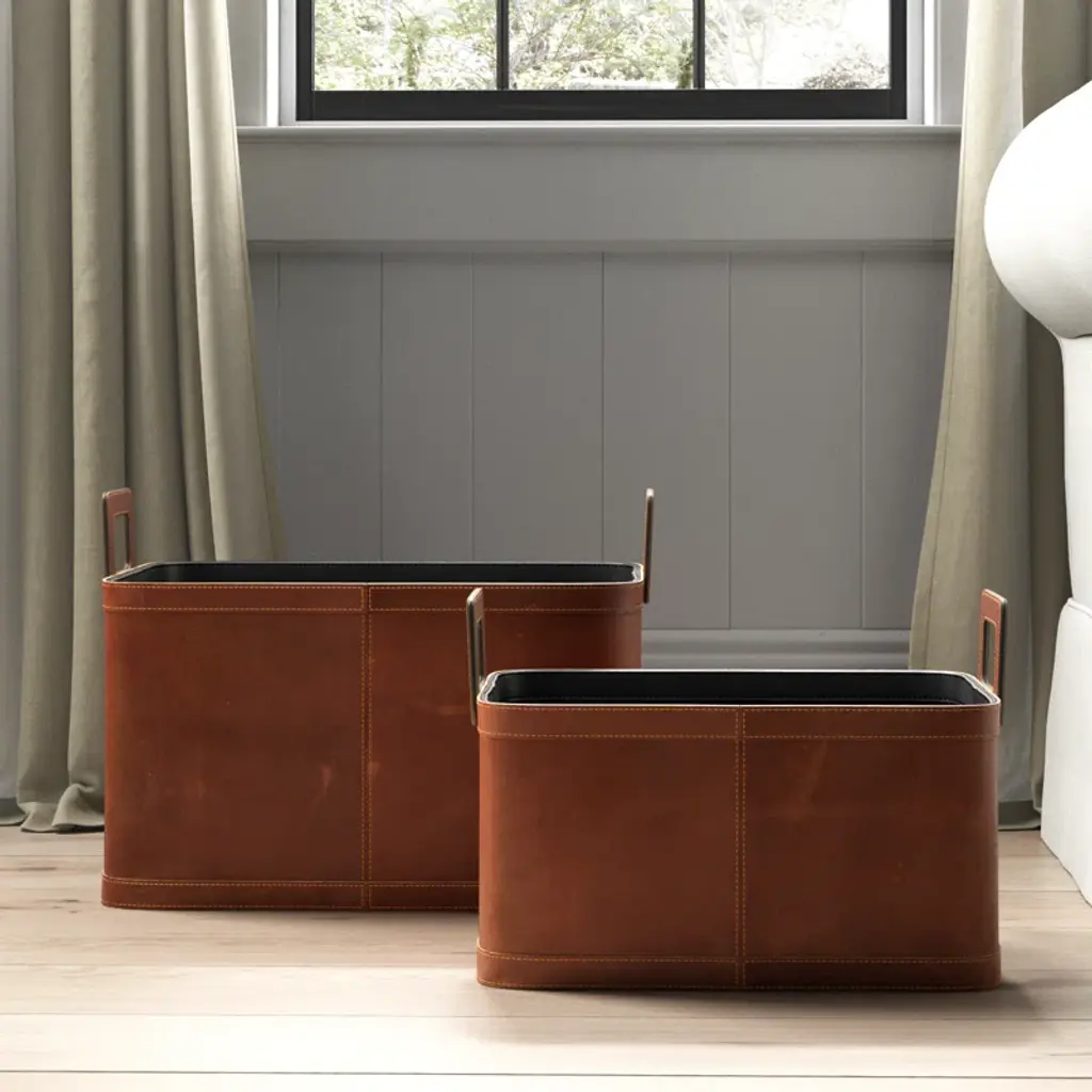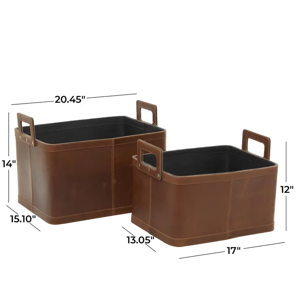 Discover a stylish way to declutter your space with this set of two woven baskets. Crafted from engineered wood and genuine leather, these rectangular baskets showcase a tasteful blend of materials. The leather handles make them easy to move around, while their nesting design allows for convenient storage when not in use. Ideal for organizing your living room, bedroom, or office, these baskets add a touch of sophistication to your home. Just remember, they're meant for residential use, so enjoy them in your own cozy space.