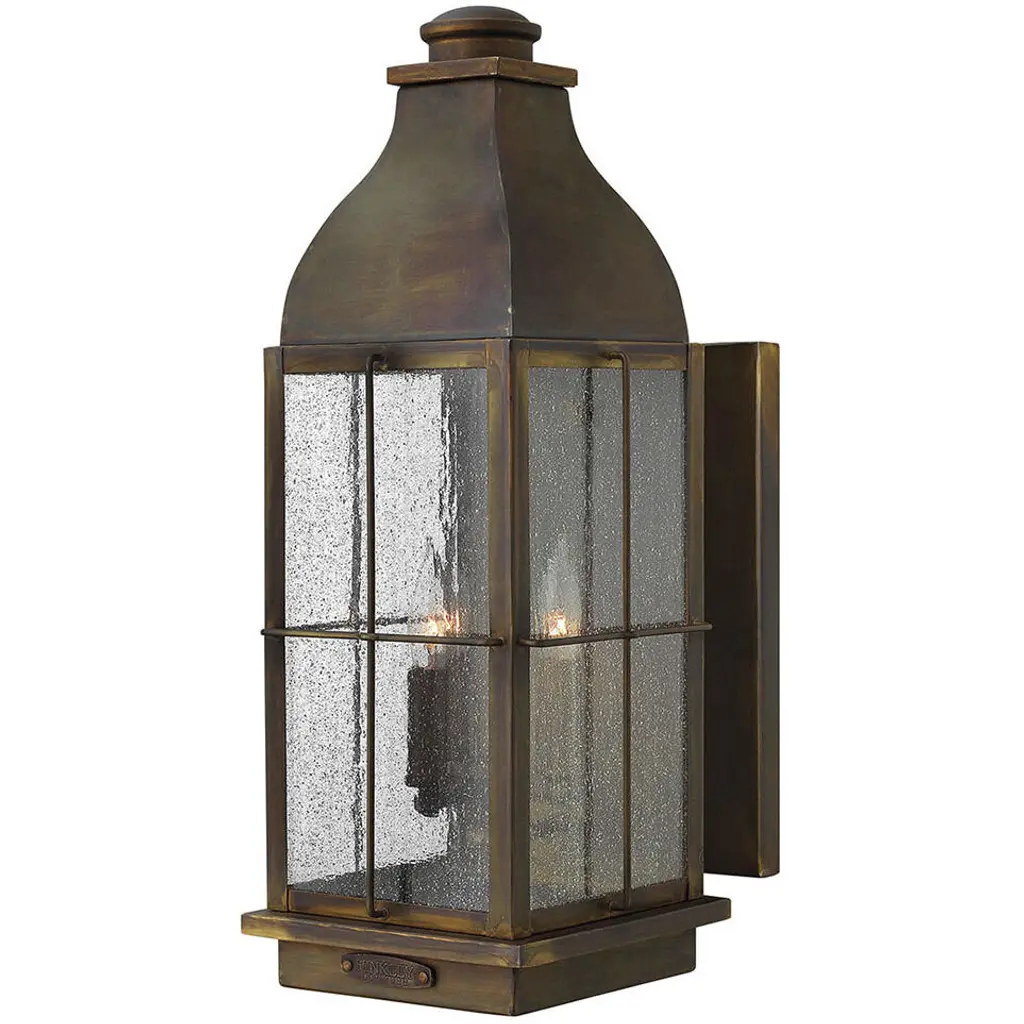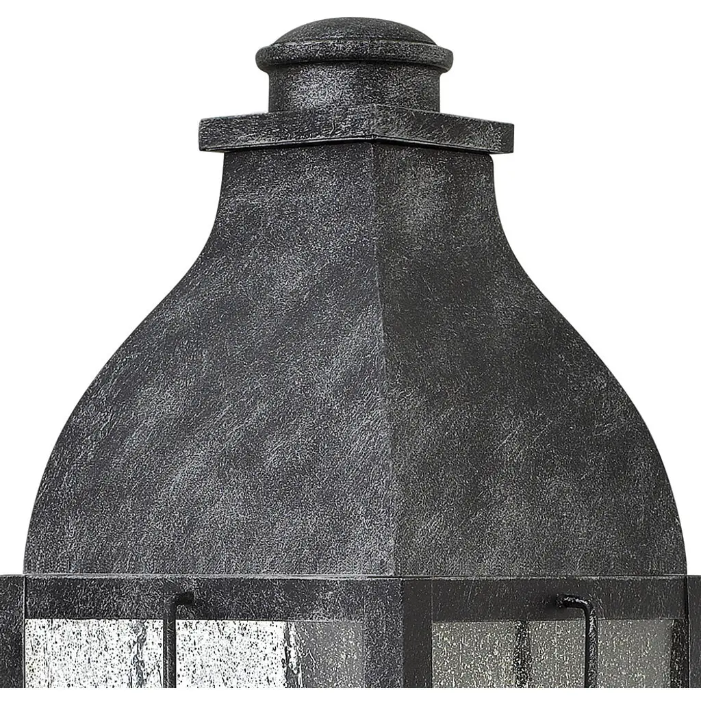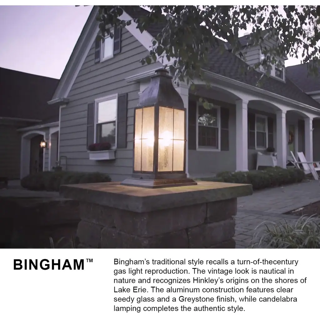 The Heritage Collection encompasses premium outdoor fixtures that pay tribute to the nostalgia of America's past while reinforcing Hinkley's philosophy of timeless, quality design. Bingham's traditional style recalls a turn-of-the-century gas light reproduction. The vintage look is nautical in nature and recognizes Hinkley's origins on the shores of Lake Erie. The aluminum construction features clear seedy glass and a Greystone finish, while candelabra bulbing completes the authentic style.