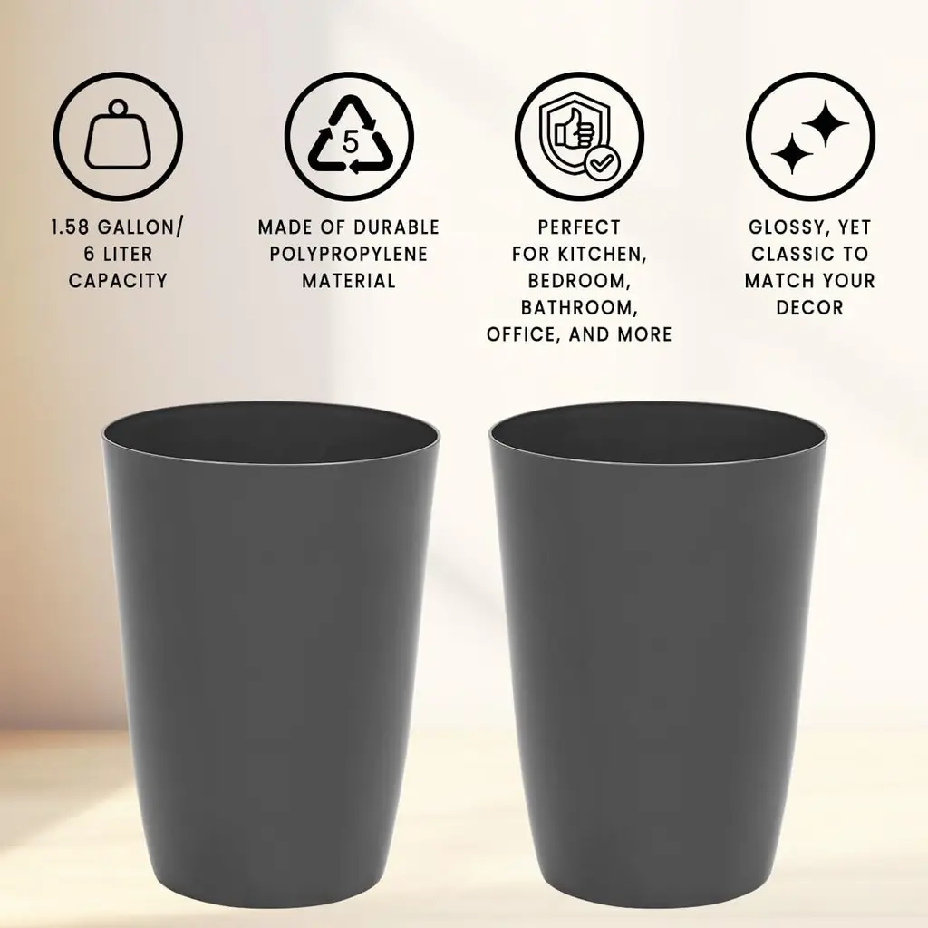 Upgrade your small space with this set of 2 Small Trash Cans, perfect for kitchens, bathrooms, offices, and more. Its compact design fits neatly beside toilets, under sinks, and in tight corners, offering a sleek solution for managing waste discreetly. Made from durable polypropylene plastic, it ensures longevity and easy maintenance with a simple wipe-clean surface. With a generous 1.58-gallon capacity, it handles various types of trash and recyclables effortlessly, making it an essential addition to any home or commercial environment. Choose practicality and style with this versatile trash can.