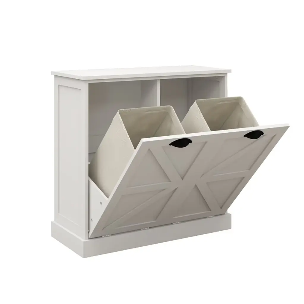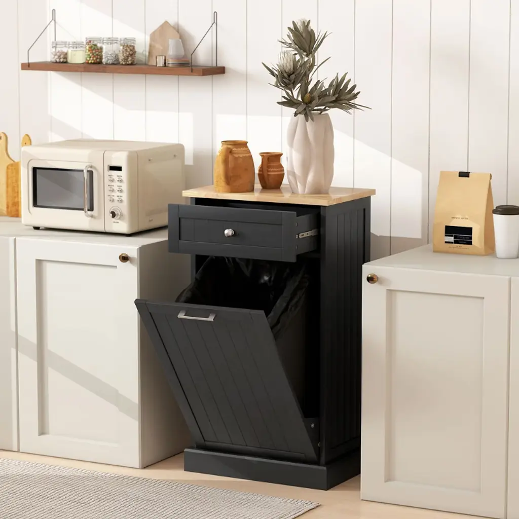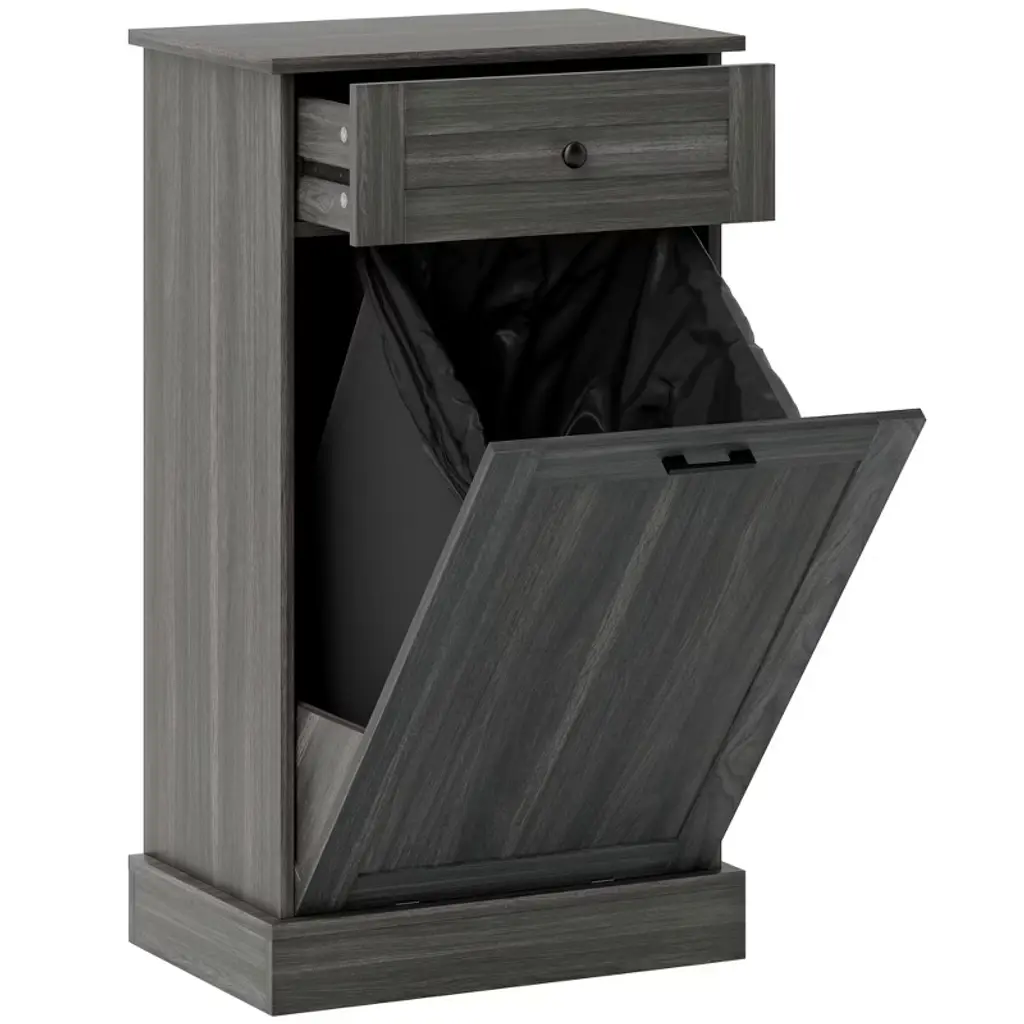 Choose our trash bin cabinet, make your home a better-organized place. With good capacity, it is great for kitchen garbage. And the tipping waste container offers you great convenience to get rid of trash when your hands are occupied. This storage organizer is versatile and can be used either as a hidden dustbin or an island. This cabinet with dustbin with oak wooden grain table top features a decoration to your home. Make dinner prep easier with this trash can storage cabinet from HOMCOM.