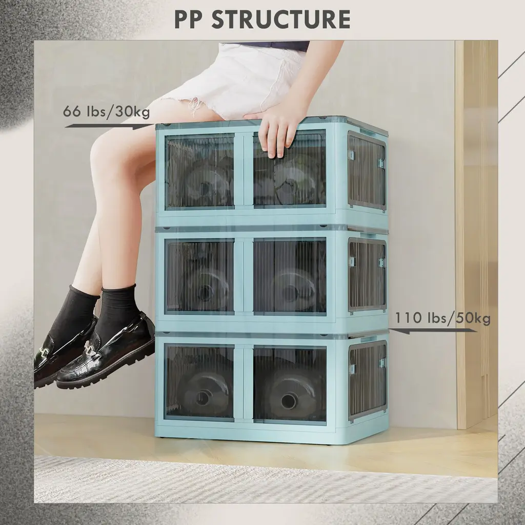 Descriptions:Introducing the HOMCOM collapsible storage bins, a versatile solution for all your storage needs. Whether you need extra storage in your living room, office, or car, this chest can do it. Its foldable design allows for easy portability and convenient storage when not in use. With 5-sided access, you can retrieve and store your belongings. The grooved top provides a secure stacking option, allowing you to maximize your storage space efficiently.Features:● Foldable design for easy transportation and storage● 5-sided access for convenient retrieval● Equipped with four wheels for effortless mobility● Grooved top for secure stacking of multiple units● Made from stable and safe polypropylene● Each door is equipped with pins to prevent items from falling out● A removable dust baffle and ventilation holes in the top panel● Suitable for living rooms, offices, and car storage● No assembly requiredSpecification:● Color: Blue ● Material: Polypropylene● Overall Dimensions: 23.5" W x 16.5" D x 13.5" H● Folded Dimensions: 23.5" W x 16.5" D x 3.25" H● Inner Size: 22" W x 15.25" D x 12.5" H● Storage Capacity: 18 gallon● Weight Capacity: 110 lbs. (Inner), 66 lbs. (Top) ● Item Label: 838-441V01BU