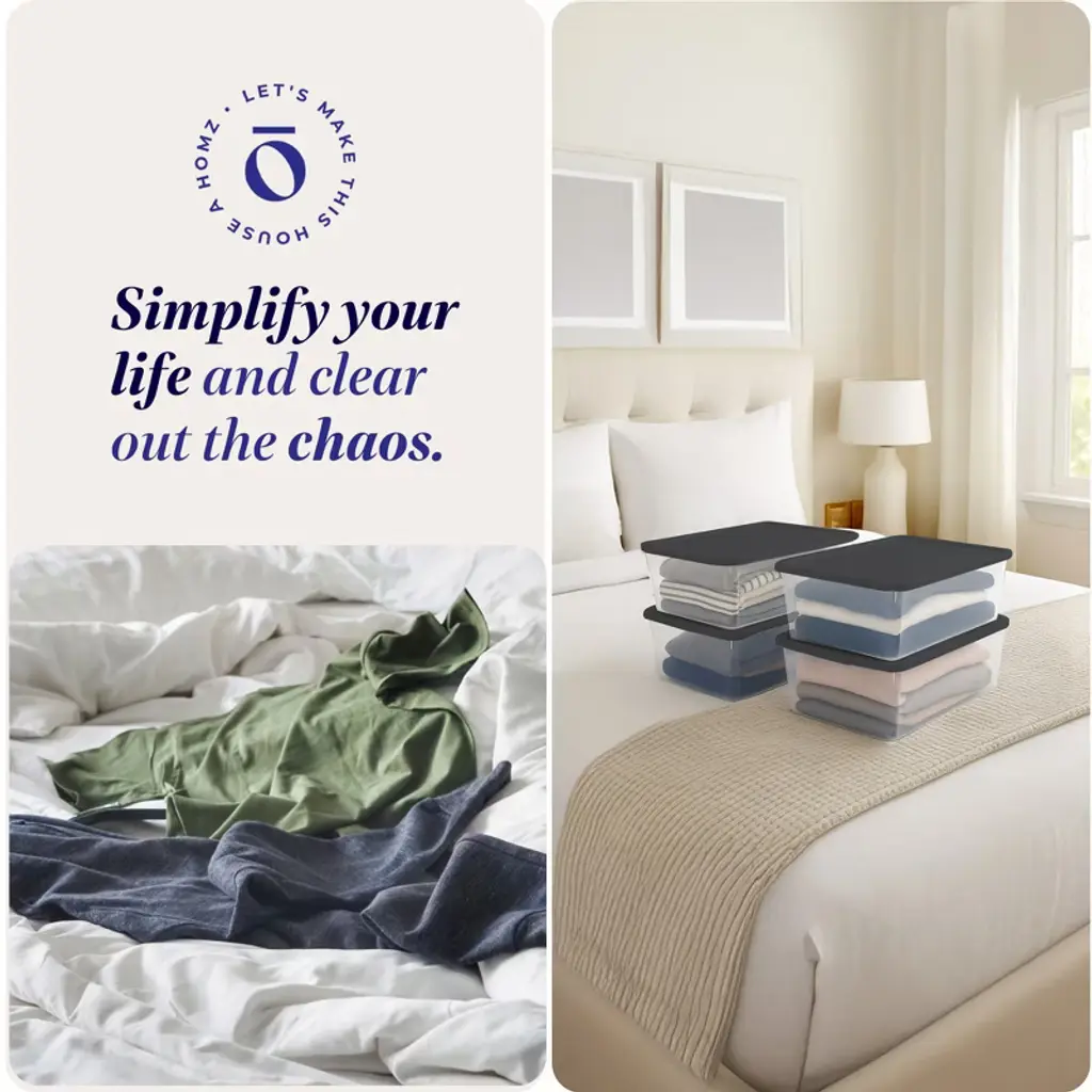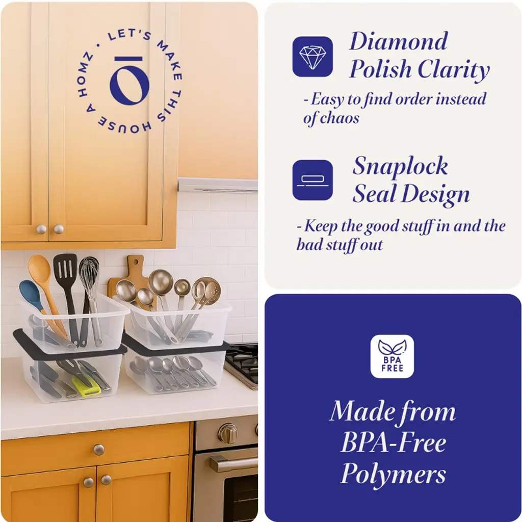 Get the most out of your space with the 8-pack of Homz Plastic Storage Containers. Ideal for storing away holiday decor, shoes, office supplies, kitchen utensils, and so much more, the opportunities with these totes are endless. Featuring secure snaplock lids, these storage containers offer a robust safeguard, guaranteeing the confinement of your personal items in a dry and secure environment, effectively shielding them from dust and debris. The clear design makes these containers even better. You can easily see what's inside without opening them, which saves time looking for things. This feature also helps you find items quickly and keeps your storage organized. Profoundly indented lids and a modular design enable secure stacking, optimizing vertical storage capacity in your kitchen, bathroom, and closet. Bins fit snugly when stored away, promoting efficient organization. Ideal for bathroom, kitchen, garage, dorm, and off-season storage, these storage containers are designed for extended and enduring utility. Each bin is constructed of robust, high-strength plastic with dimensions of 11 inches long, 16.25 inches wide, and 5.62 inches tall. With the 5.62-inch height, the clear organizer box is great for under-bed storage, too! Take your organization skills to the next level with these 8 Plastic Storage Containers from Homz.